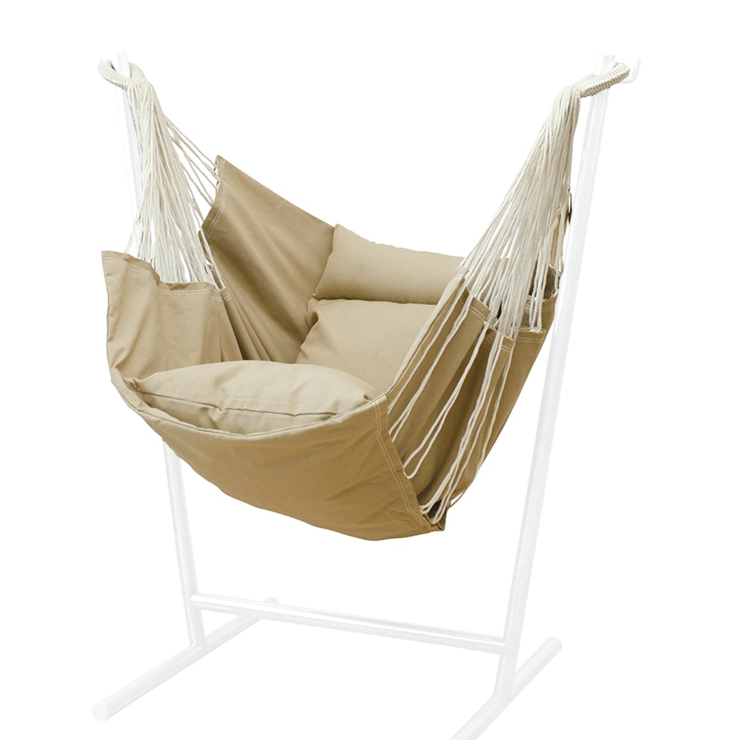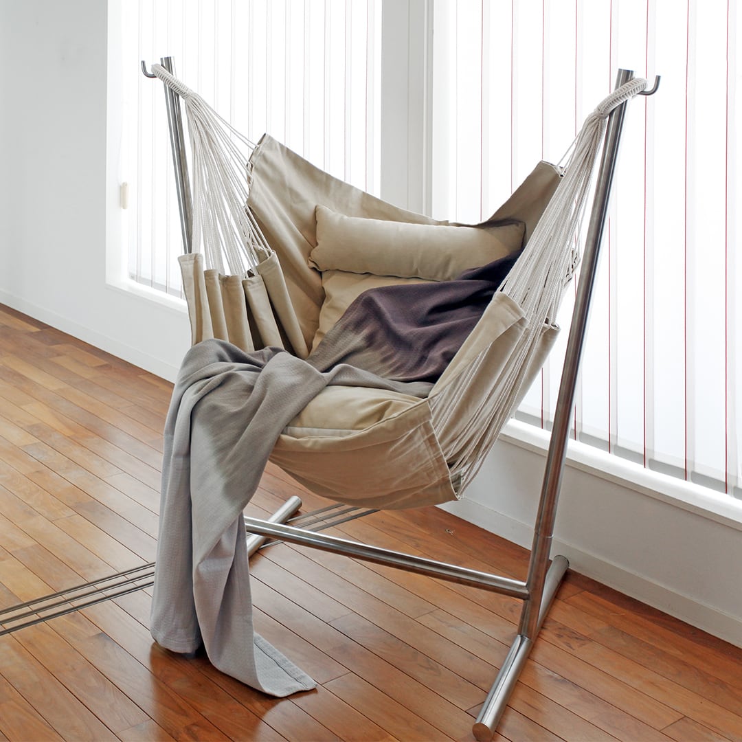 ご家庭で1人になる時間・空間が欲しい!という方におすすめ。しっかりと体全体が支えられ、付属するクッションによって柔らかでラグジュアリーにお寛ぎいただけます。一般的なハンモックとは異なり、座りながらテレビを楽しむことができます。持ち運びも簡単でキャンプなどシーンにも活躍します。シエスタで有名なスペインならではの発想を生かした1人掛けハンモックです。