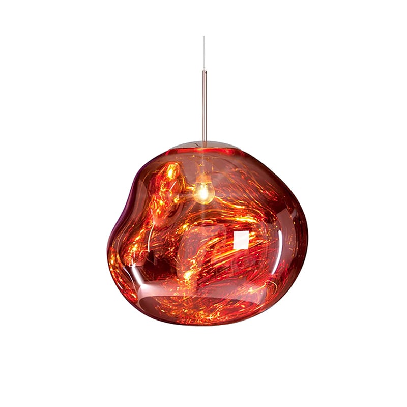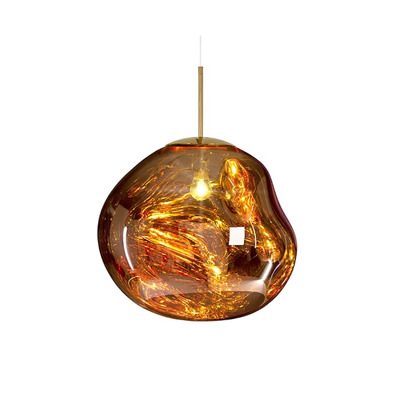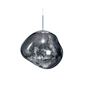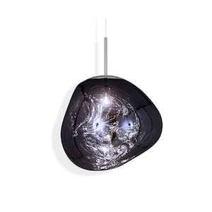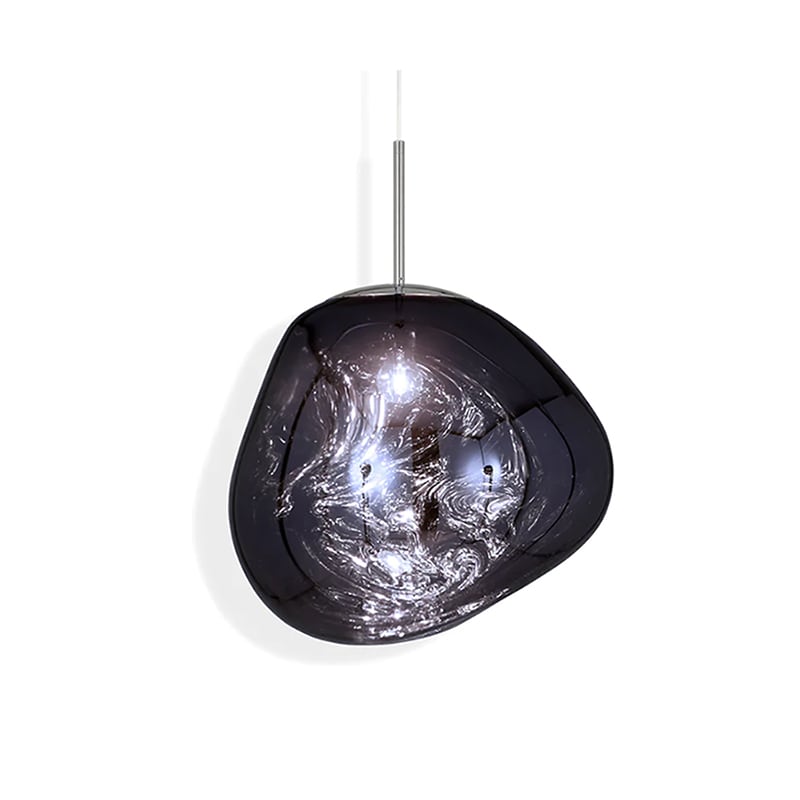 溶鉱炉で熱せられ、膨らんでいく吹きガラスのように、一見生命体のような意匠が特徴の「MELT(メルト)」。見る角度によって形が違って見えることから、ハンドメイドのガラス製品のように見えますが、シェードは射出成型されたポリカーボネートでできています。シェードの中は特殊な真空蒸着によって塗装され、シェード上部から底部にかけて塗装の濃度を段階的に変えることで、点灯時には、物体が溶けるような視覚効果を生み出し、消灯すると空気を漂う鏡面のオブジェへと変化します。トム・ディクソンが独自に開発した内蔵型LEDを使用することにより、電球タイプの「MELT(メルト)」よりも、シェード全体に光が行き渡って溶け落ちるような視覚効果を生み出し、全く違う照明へと進化を遂げました。