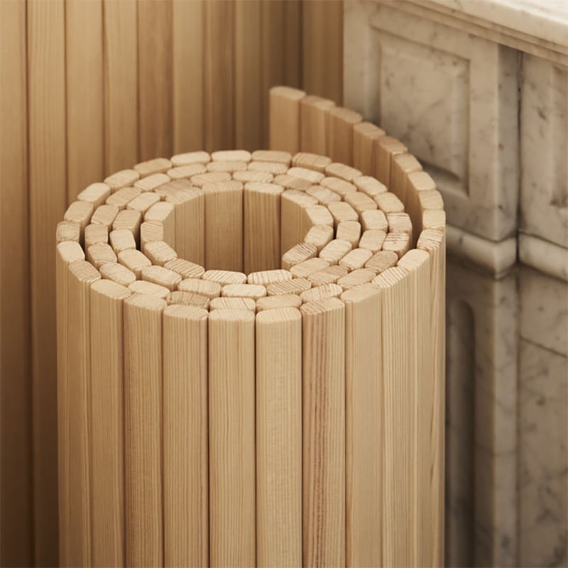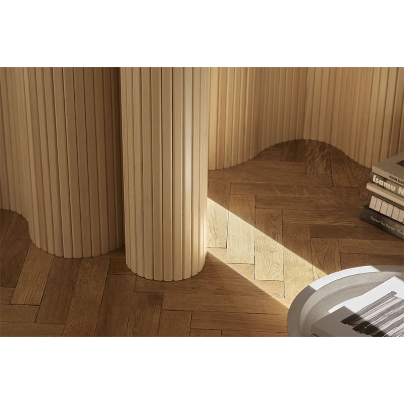 「パーテーション 100」は、パイン材を垂直に並べ、繋ぎ合わせたシンプルな構造です。そのため、直線的に用いて間仕切りとしても、保管するために巻いておくことも、流れるような曲線型として配置することもできます。フィンランドを代表する建築家でありデザイナーのアルヴァ・アアルトらしい有機的で柔らかなフォルムは、時を越えて愛され続けています。