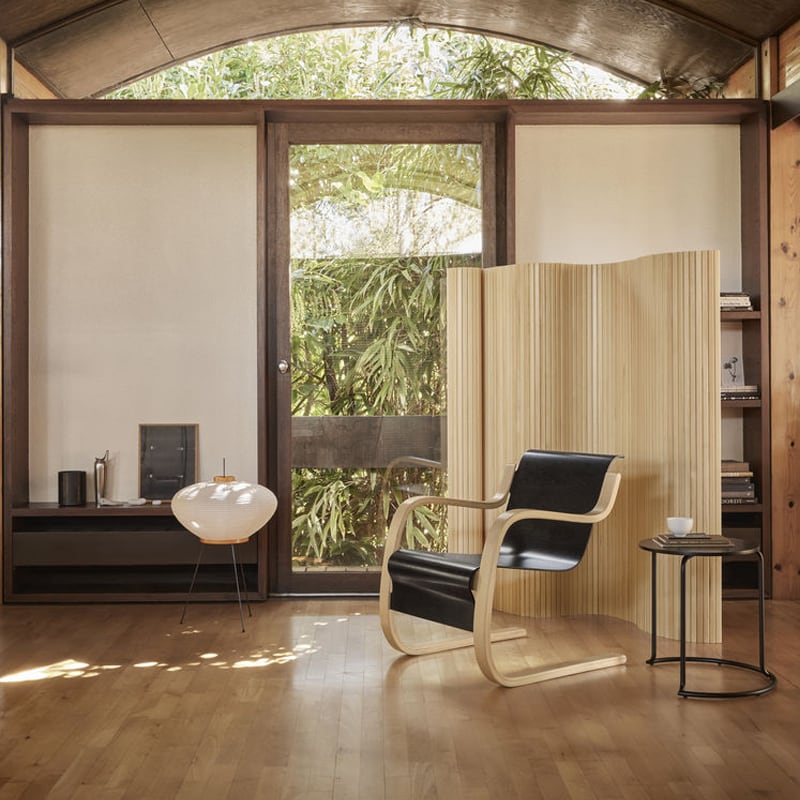 細いパイン材をすだれ状に垂直に配した「パーテーション 100」。部屋の間仕切りとして使用できるだけでなく、端から巻いて収納することもでき、持ち運びも簡単です。150cmの高さは、完全に視界を遮断することなく、スクリーンのように空間を区切ることができます。アルヴァ・アアルトのデザインによるパーテーション100は、フィンランドで伝統的に使われている木材を使い、彼の哲学をそのまま体現した有機的な形を自由につくることができ、インテリア空間に温かみを加えてくれます。