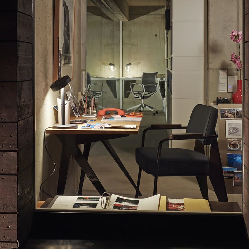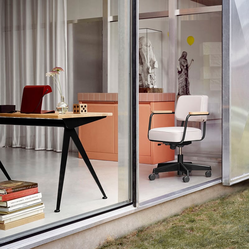 ジャン・プルーヴェによってデザインされた「コンパス ディレクション」は、シャープでエレガントに広がるスチール製の脚がコンパス(フランス語で‘le compas’ )の針を端的に表現しています。その合理的な構造は、デザイナーであり、エンジニアでもあるプルーヴェならではの特徴と言えます。オイル仕上げのソリッドウッドが用いられた天板と、スチール製の脚とのダイナミックなコントラストがホームオフィスの空間を魅力的に彩ります。