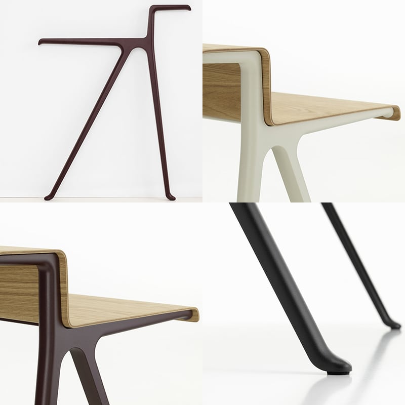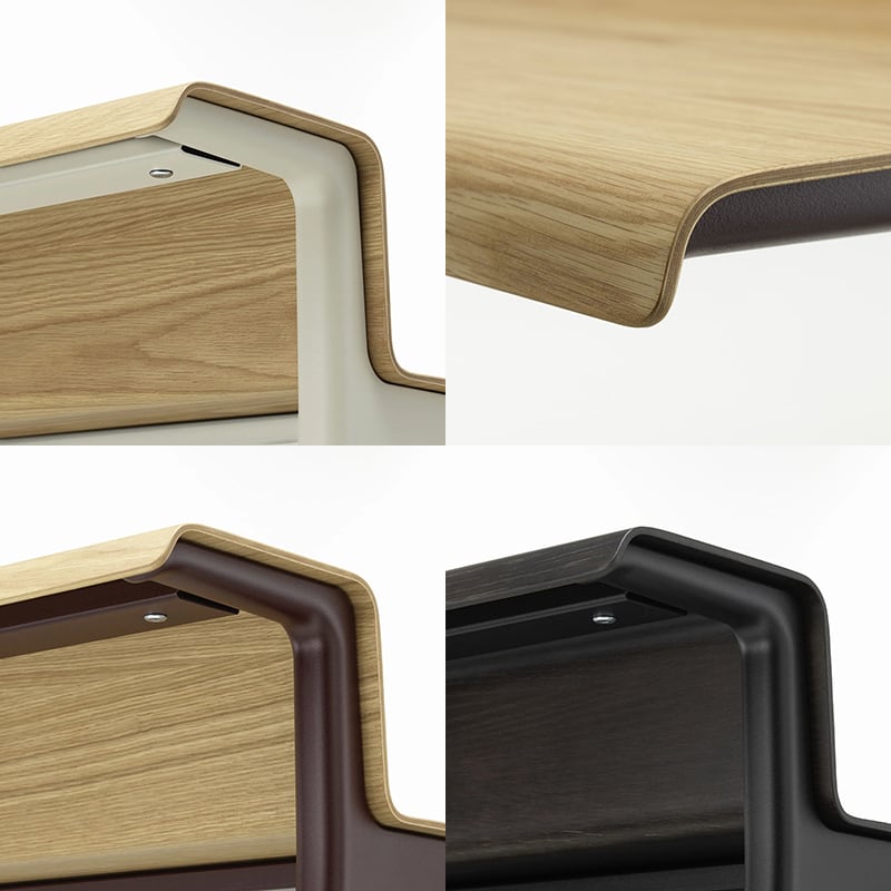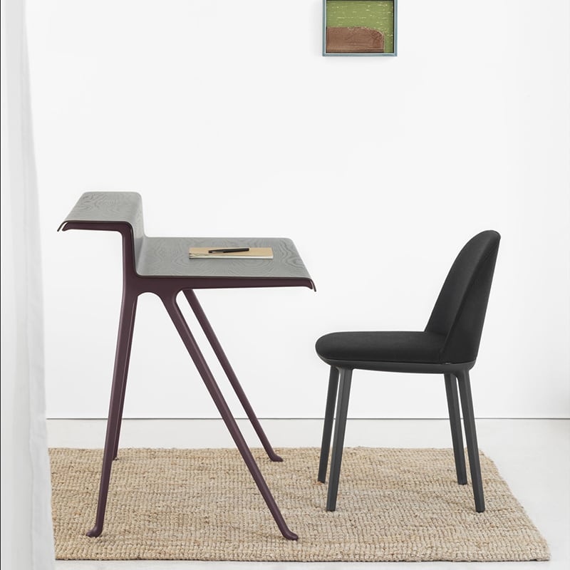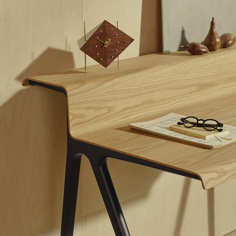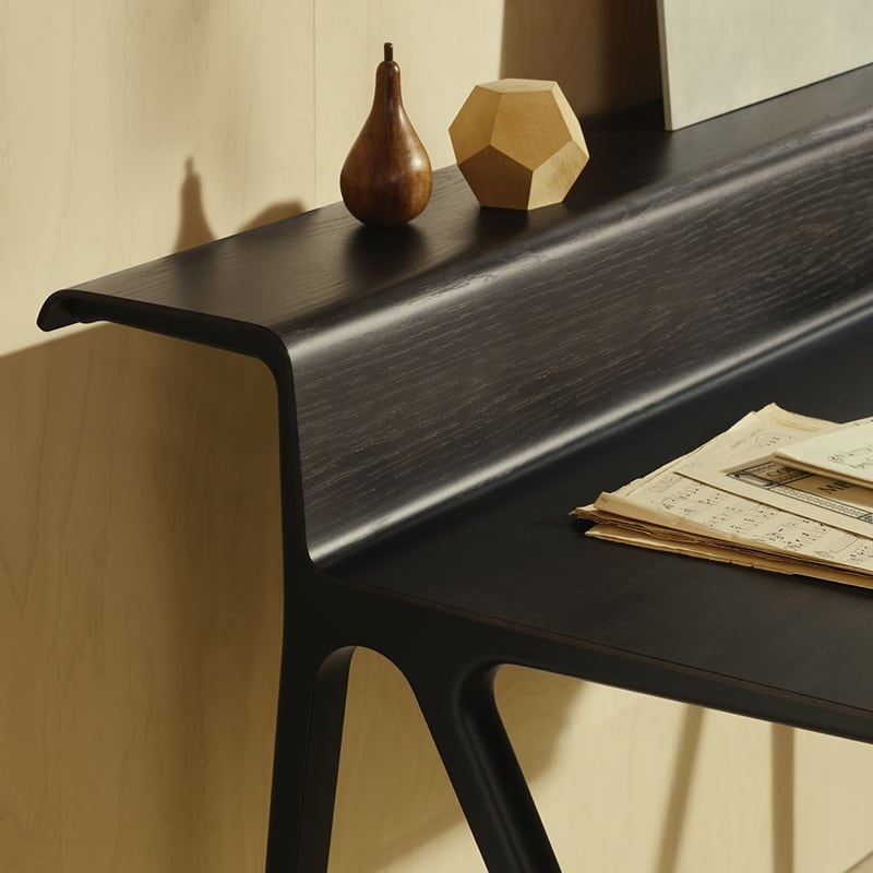 新作「クーリエ」は、デスクとしての機能性と彫刻のような美しさを兼ね備えています。木とアルミニウムという異なる上質な素材を組み合わせ、個性的でありながら控えめな存在感を放っています。この新作を手掛けたロナン・ブルレックは、プロダクトデザイナーでありながらアーティストとしても活躍しており、「クーリエ」の輪郭は彼の芸術的な表現を反映するとともに、造形力や構成力、技術的な熟練を表現しています。また、側面から見ると、このデスクのシルエットは欧文フォントのセリフ体のひとつである『クーリエ』を彷彿とさせ、その名が付けられました。