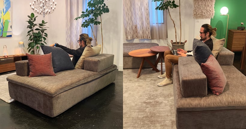 コイルスプリングで構成されているので、底打ち感のないクッション性はとても座り心地がよく、デイベッドとして寝そべるにも快適な2m幅。壁付けでも、壁から離しても設置場所を問わず、どこからも座れるのも快適です。