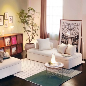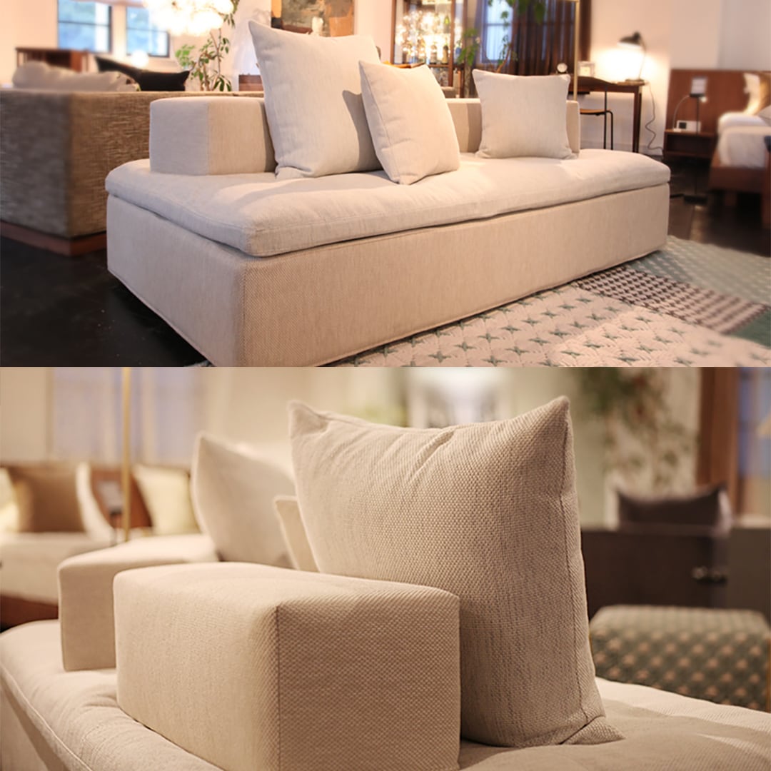 リアルスタイルオリジナルの国産ファブリックソファです。ゆったりとした奥行きとワイドは解放感があり、家族それぞれがソファで寛ぎ集う憩の場となります。最高級のベッドがそのままスタイリッシュなソファになったかのようです。耐久性とクッション性に優れたコイルスプリングの技術を駆使したソファベース。背もたれになるクッションは1つ約5kgと重みを持たせてありますが、自由に動かす事ができる置き型。背もたれ、クッションを自由に組み合わせて、あらゆるシーンに合わせることができます。またスツールとあわせてL字の形にしたり、空間、用途にあわせてレイアウトいただけけます。
