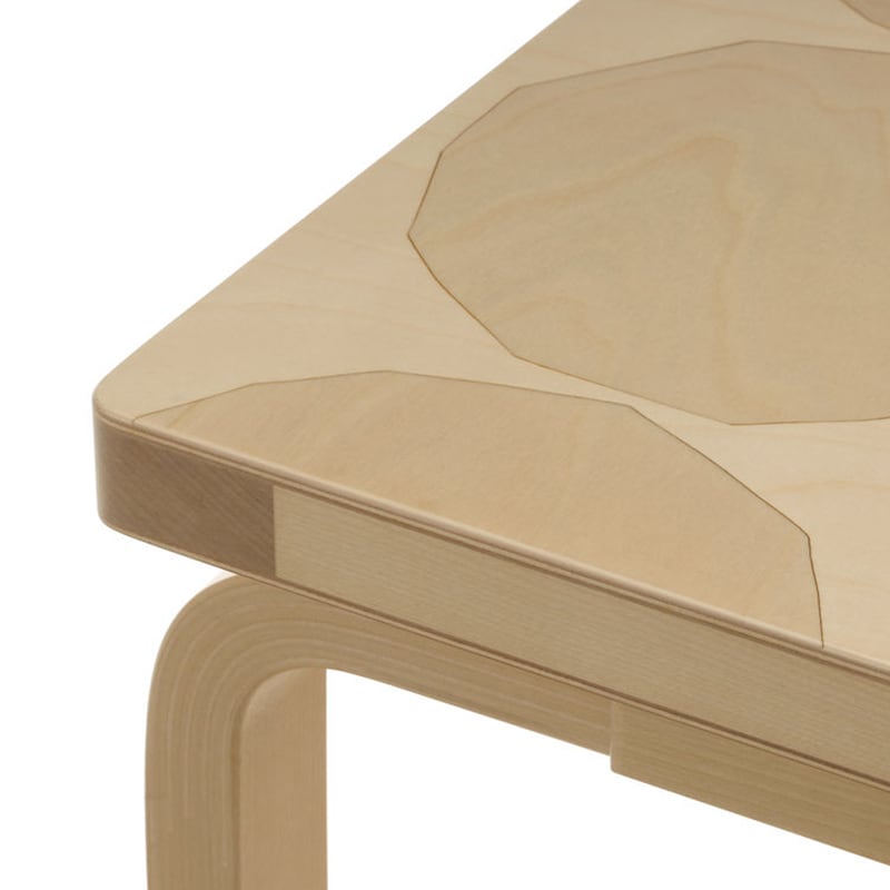 マイヤ・イソラが1956年に発表した柄「Kivet(キヴェット)」パターンは、彼女のアトリエ兼住宅の敷地から拾った、大きくて粗い石からインスピレーションを得たとされています。座面の突板に象嵌(ぞうがん)細工の技法を使い、異なる木目を組み合わせることで、光とパターンと木目の融合と相互作用が生まれ、パターンがより一層活き活きとして見えます。