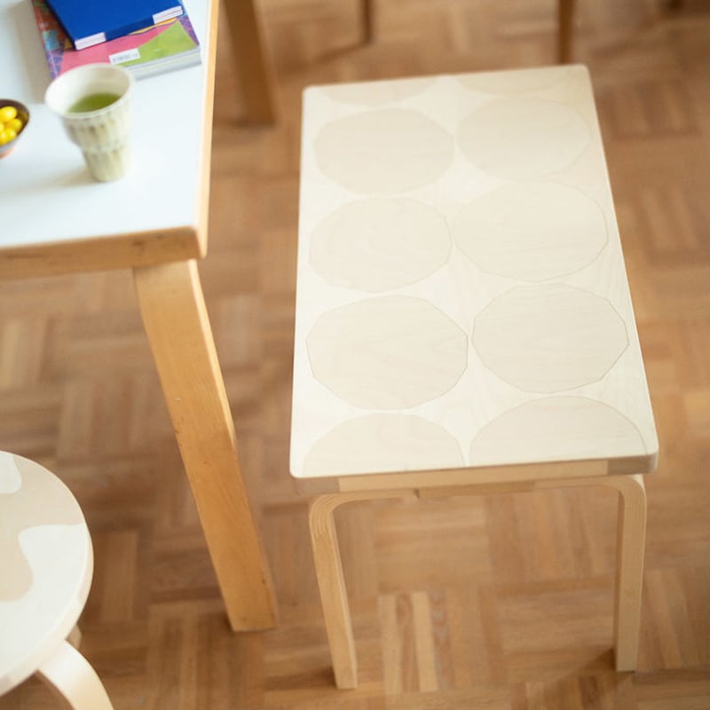「アルテック + マリメッコ」シリーズは、マリメッコのプリント作りのアートと、アルテックの木工技術の融合です。 マリメッコのデザイナーであるマイヤ・イソラが手掛けた象徴的なパターンが、アルヴァ・アアルトのデザインによる「スツール 60」、「ベンチ 153B」、円形の「テーブル 90D」と出会い、美しく溶け合います。表面の突板をパターンの形に切り取り、それを別個体の該当箇所にはめ込む技術を用いた、本質的かつ斬新な形のコラボレーションにより、マイヤ・イソラの鮮やかなプリントデザインは、味わい深い木目と木地のコントラストに変換されます。