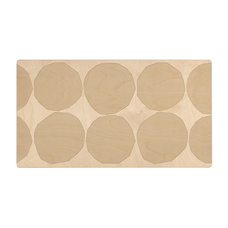 「アルテック+マリメッコ」のシリーズでは、鮮やかなプリントを塗装ではなく、異なる木目を持つバーチ材を組み合わせる寄木細工の技法で表現しています。この技法は、模様を木材の自然な質感で描くもので、両ブランドが掲げる“長く使えるデザイン”という理念を体現しています。また、木材の無駄を最小限に抑える製造方法でもあります。対照的な木目が光を受けて反射し、見る角度によってきらめきや表情が変わる点も、このシリーズならではの魅力です。