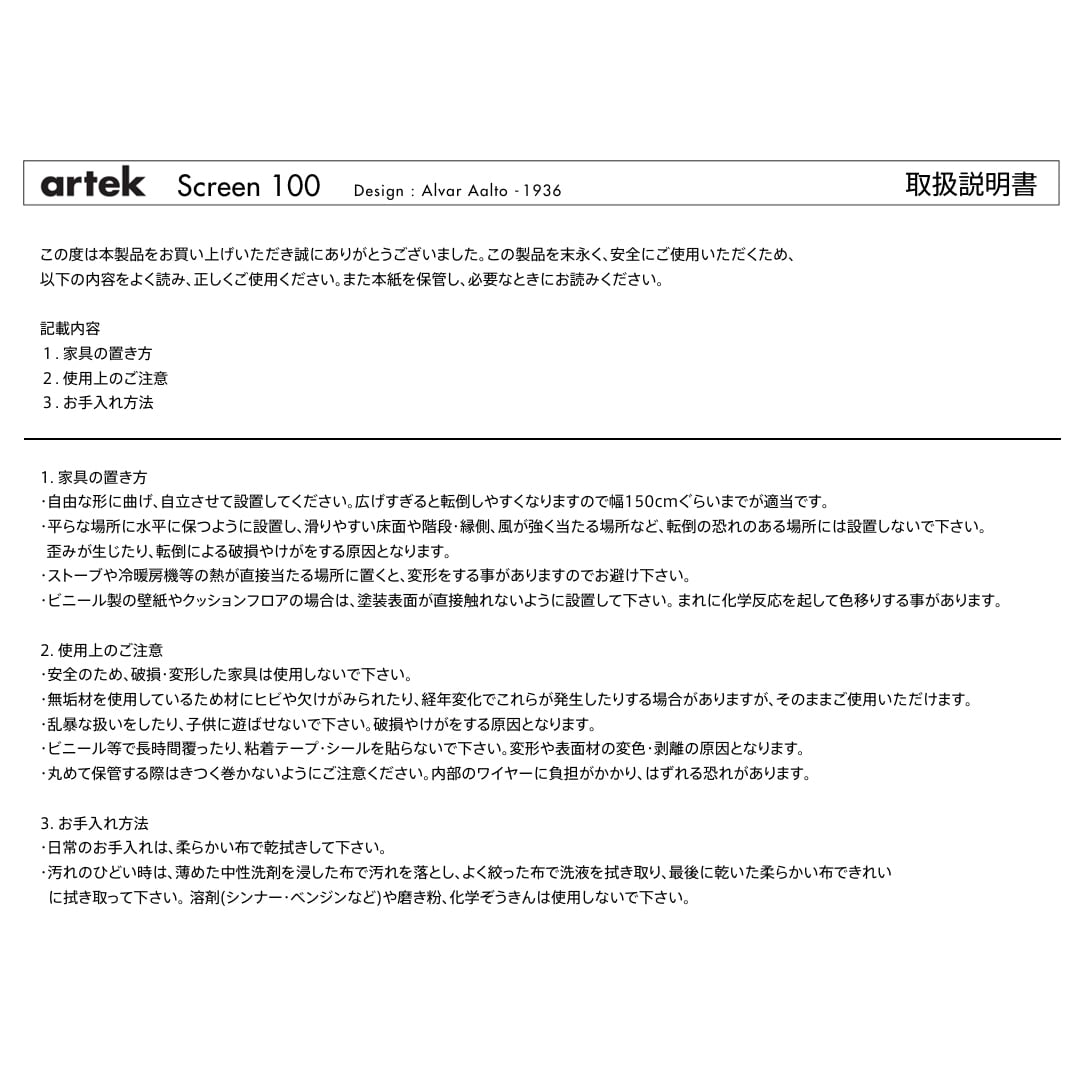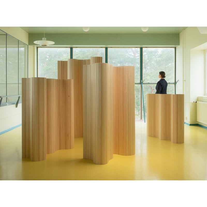 「パーテーション 100」は、パイン材を垂直に並べ、繋ぎ合わせたシンプルな構造です。そのため、直線的に用いて間仕切りとしても、保管するために巻いておくことも、流れるような曲線型として配置することもできます。フィンランドを代表する建築家でありデザイナーのアルヴァ・アアルトらしい有機的で柔らかなフォルムは、時を越えて愛され続けています。