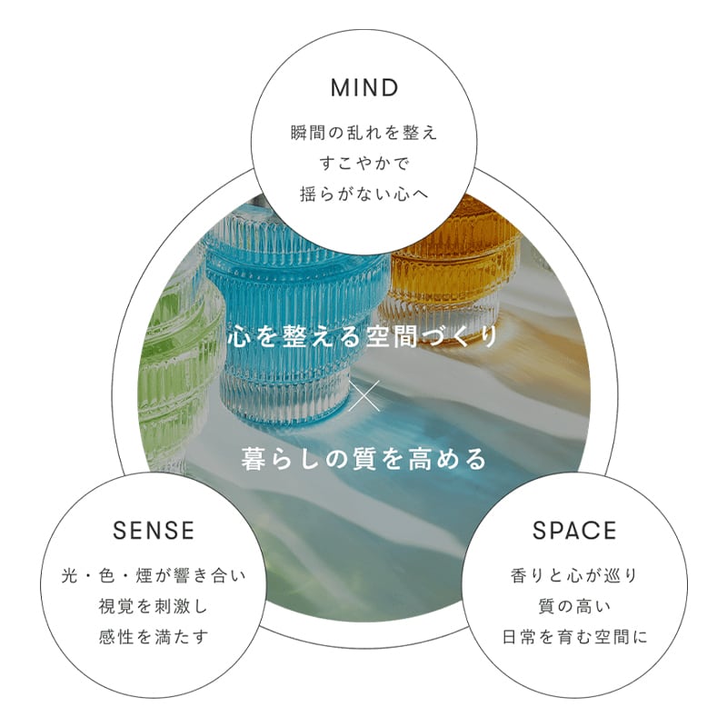 その中でふと生まれる小さな乱れを、香りの力で整えていくことで、暮らし全体が穏やかに育まれ、やがて心のあり方もそっと変化する。香水のようにトップ・ミドル・ラストと、時間とともに美しく移ろうディフューザー。香りが空間にそっと溶け込み、日常や心にやさしく寄り添う。脳波解析に基づいたエビデンスのある香りが穏やかに広がり、心の波を穏やかに整えていく。