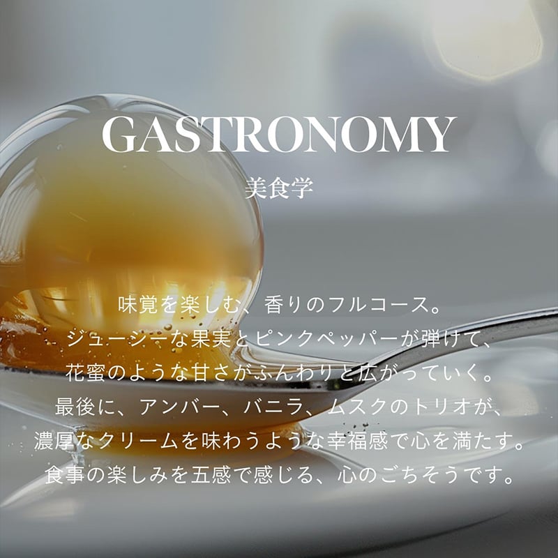 味覚を楽しむ、香りのフルコース。レモンとピンクペッパー、ブラックカラントがジューシーに弾ける。ジャスミンの花蜜のような甘さがふんわりと広がり、やがてアンバー、バニラ、ムスクが重なって、濃厚なクリームを味わうような幸福感に包まれる。“おいしい” は、究極の癒し。香りで味わう、心のごちそうを̶̶自分を甘やかすための空間に。