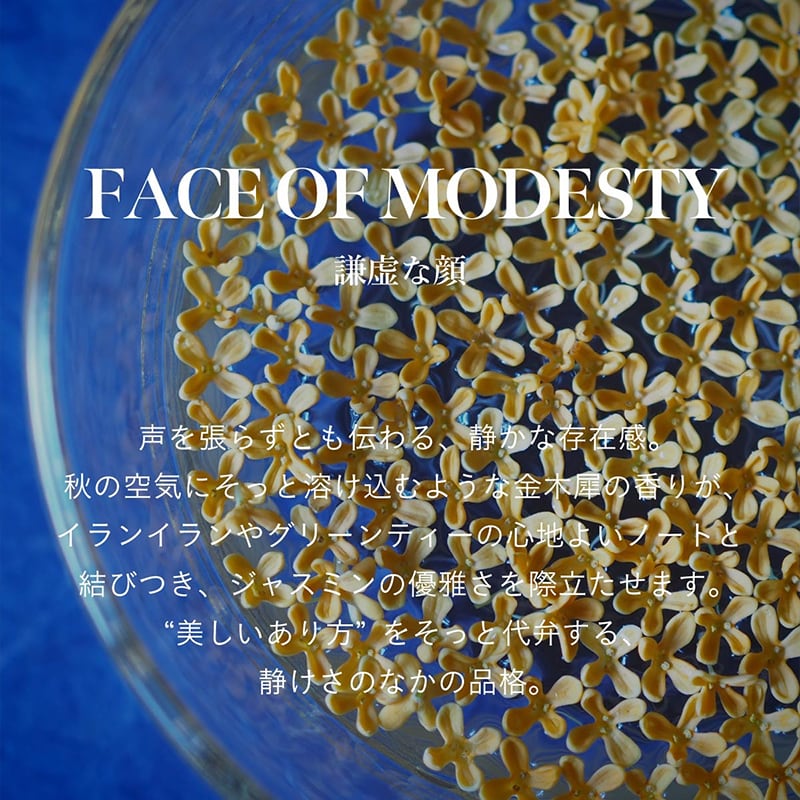 声を張らずとも伝わる、静かな存在感。それはまるで、秋の空気にそっと溶け込む金木犀の香りのよう。ベルガモットと金木犀がふんわりと立ち上り、グリーンティーとジャスミンが清らかさと静けさを重ねていく。そこにイランイランの甘さが奥行きを添え、サンダルウッドとバニラがやさしく余韻を包み込む。どこか儚く、透明感をたたえた香りは、主張しなくても心に残る。“美しいあり方” をそっと代弁する、静けさのなかの品格。