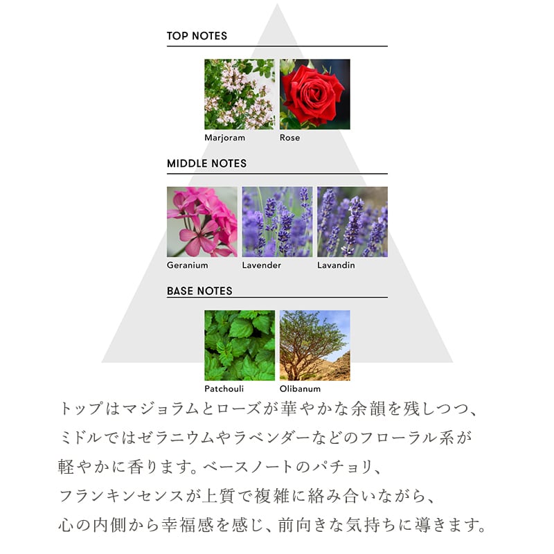 トップはマジョラムとローズが華やかな余韻を残しつつ、ミドルではゼラニウムやラベンダーなどのフローラル系が軽やかに香ります。ベースノートのパチョリ、フランキンセンスが上質で複雑に絡み合いながら、心の内側から幸福感を感じ、前向きな気持ちに導きます。