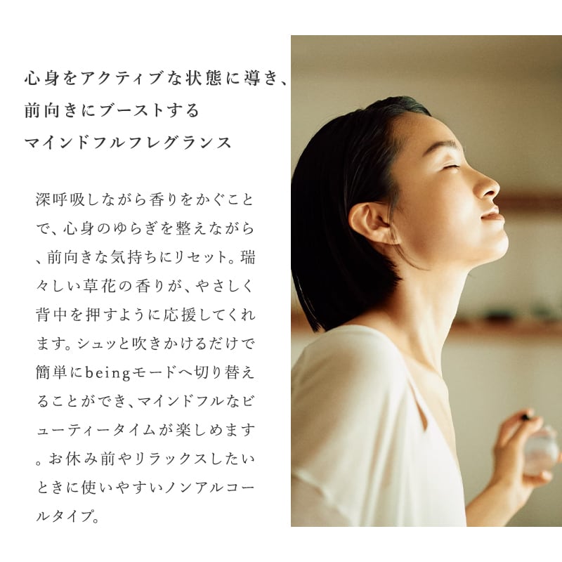 シュッと吹きかけるだけで簡単にbeingモードへ切り替えることができ、マインドフルなビューティータイムが楽しめます。お休み前やリラックスしたいときに使いやすいノンアルコールタイプ。