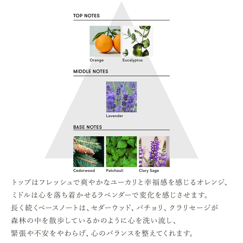 トップはフレッシュで爽やかなユーカリと幸福感を感じるオレンジ、ミドルは心を落ち着かせるラベンダーで変化を感じさせます。長く続くベースノートは、セダーウッド、パチョリ、クラリセージが森林の中を散歩しているかのように心を洗い流し、緊張や不安をやわらげ、心のバランスを整えてくれます。