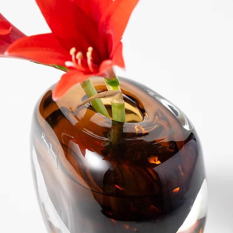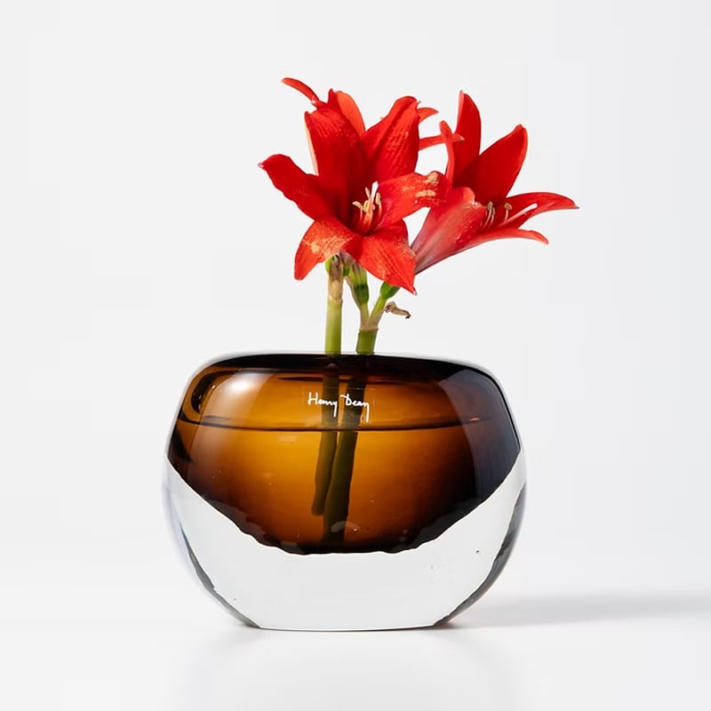 1972年にヘンリー・ディーンが創設したベルギーのフラワーベースブランド。昔ながらの手吹きガラスの手法によって生まれるやわらかなフォルムと揺らぎ、自然や日常のワンシーンから想起する洗練された色をまとったフラワーベースは、アートピースのような佇まいながら、つい触れたくなるような温かみをももっています。主な原料はリサイクルガラス。リサイクルガラスは扱いがむずかしい一方で、発色や気泡など思いがけない表情を生み出します。創業から50年以上にわたり、リサイクルガラスの可能性を追求し続けているのです。植物を引き立てるHenry Deanのフラワーベースは、日本をはじめ世界中のフローリストから愛されています。
