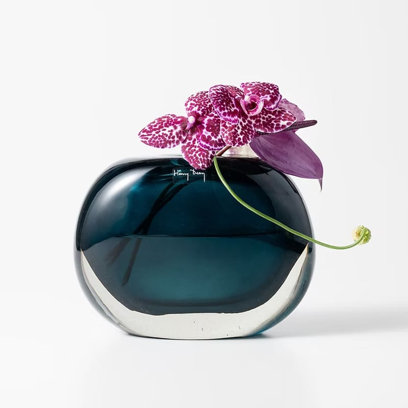 1972年にヘンリー・ディーンが創設したベルギーのフラワーベースブランド。昔ながらの手吹きガラスの手法によって生まれるやわらかなフォルムと揺らぎ、自然や日常のワンシーンから想起する洗練された色をまとったフラワーベースは、アートピースのような佇まいながら、つい触れたくなるような温かみをももっています。主な原料はリサイクルガラス。リサイクルガラスは扱いがむずかしい一方で、発色や気泡など思いがけない表情を生み出します。創業から50年以上にわたり、リサイクルガラスの可能性を追求し続けているのです。植物を引き立てるHenry Deanのフラワーベースは、日本をはじめ世界中のフローリストから愛されています。