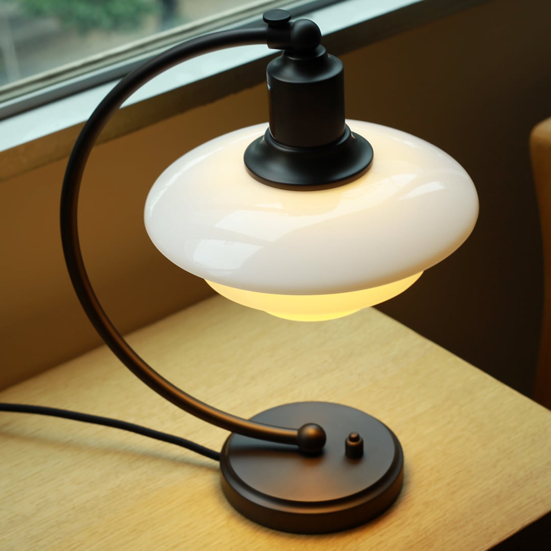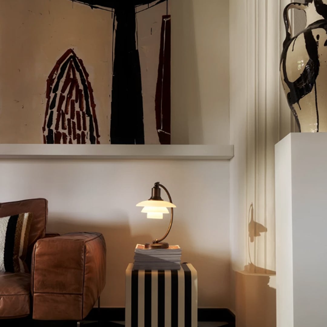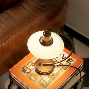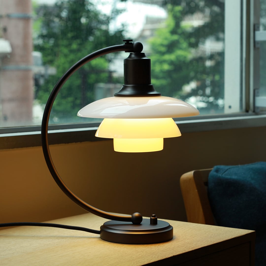 PH 2/2 Luna Aged Brass Opalテーブルランプは、 Poul Henningsen(ポール・へニングセン)独自のオパールホワイトの吹きガラス3枚を使用した3層シェードシステムが特徴。外側は光沢仕上げ、内側はサンドブラスト加工を施したマット仕上げなので、完璧な下向きの光と、一面に拡散された柔らかい光の両方を提供し、理想的なアンビエント照明を実現します。