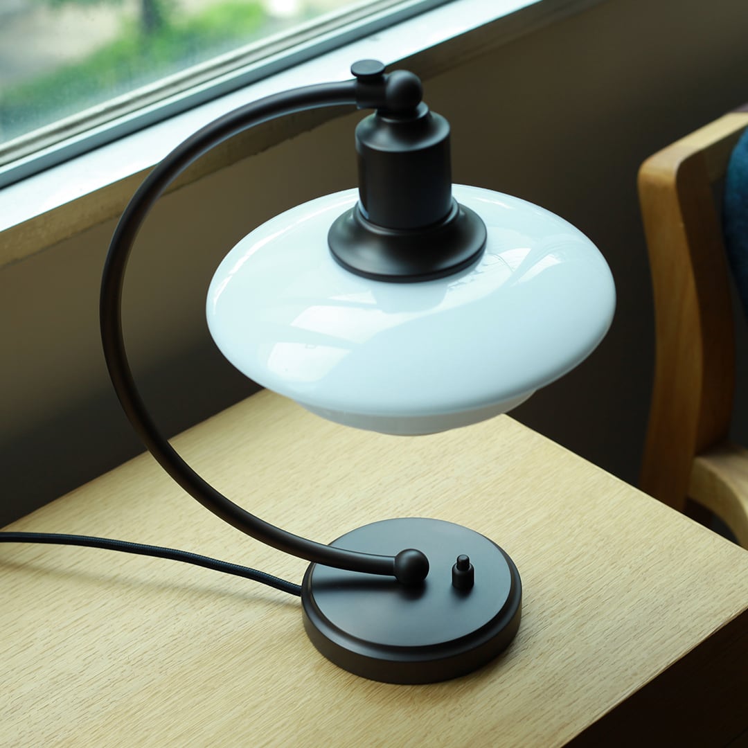 3枚のオパール吹きガラスのシェードとカーブを描くステムが特徴的なPH 2/2 Luna Limited Editionテーブルランプは、控えめで品格のあるデザインが魅力的。ブラッシュド加工を施した無塗装の真鍮で作られたベース、ステム、ソケットハウスは、時間の経過とともに美しくなじみ、ランプに独特の風合いを与えます。