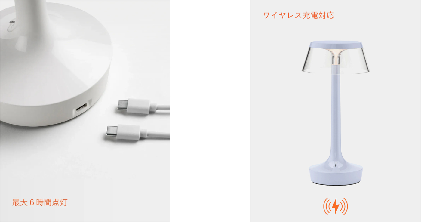 充電式リチウムバッテリーを内蔵しているため、好きな場所に置いて最大6時間点灯させることができます。USB-C端子を使って効率的に充電できるほか、新エディションではワイヤレス充電にも対応し、ケーブルを接続することなくスマートに充電することも可能です。