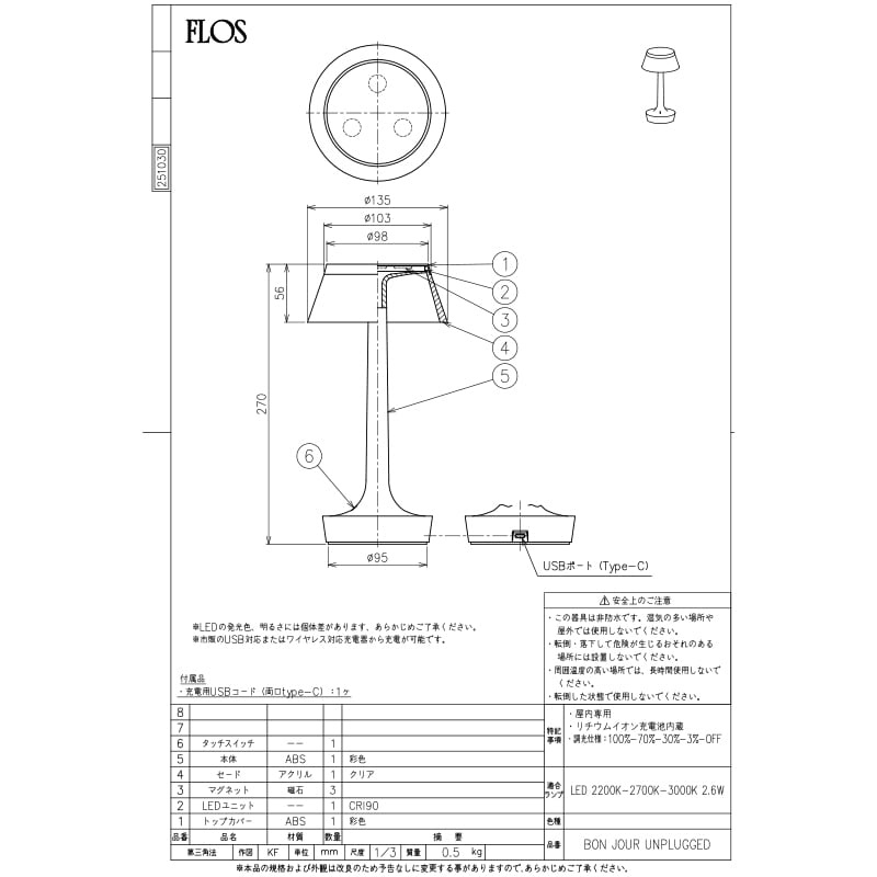 仕 様:micro-USB、4段階タッチ調光スイッチ付(100%・70%・30%・3%・OFF)、フル充連続点灯時間:約6時間 (100%点灯時)