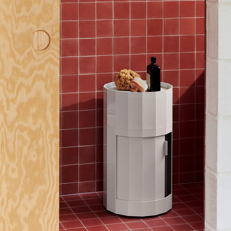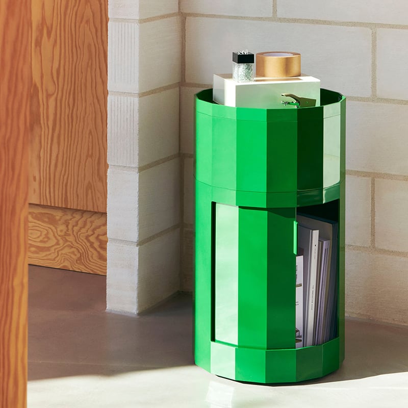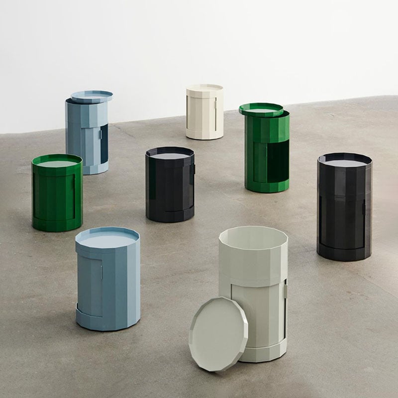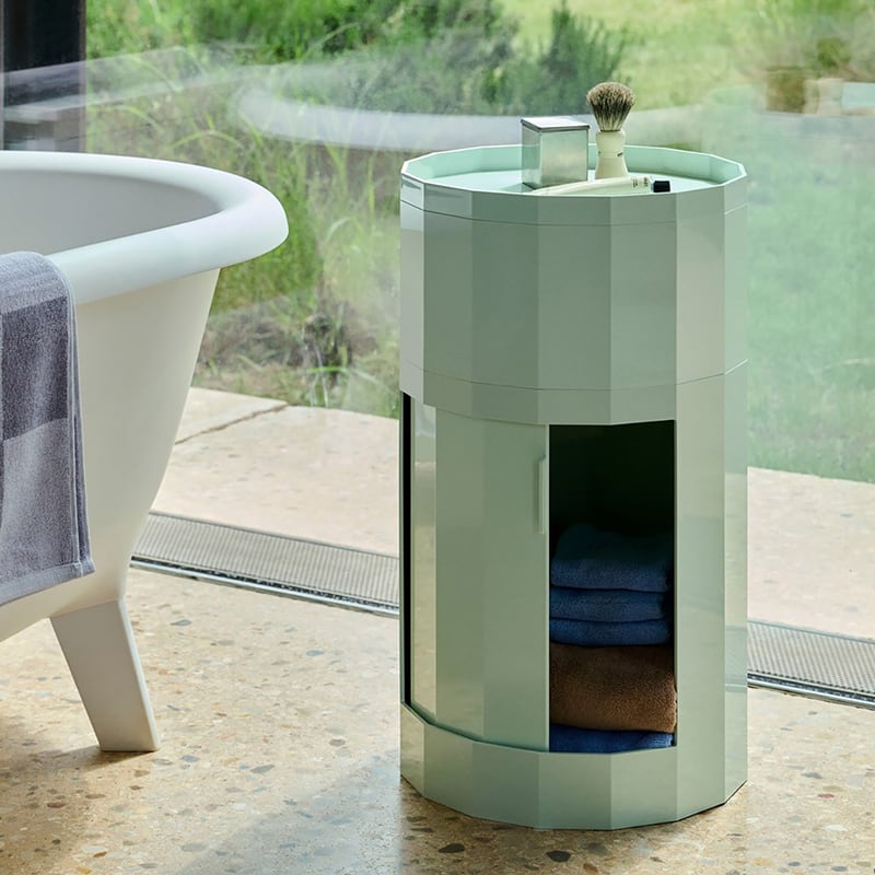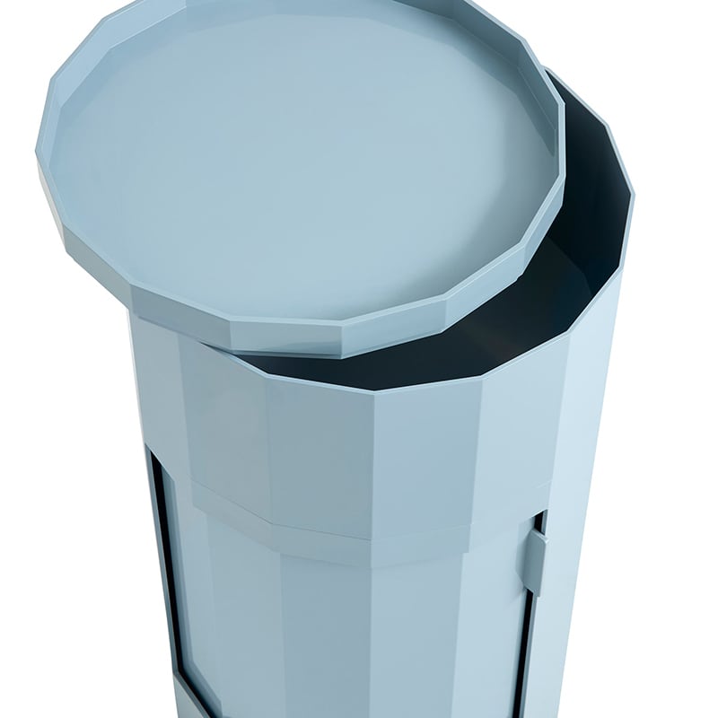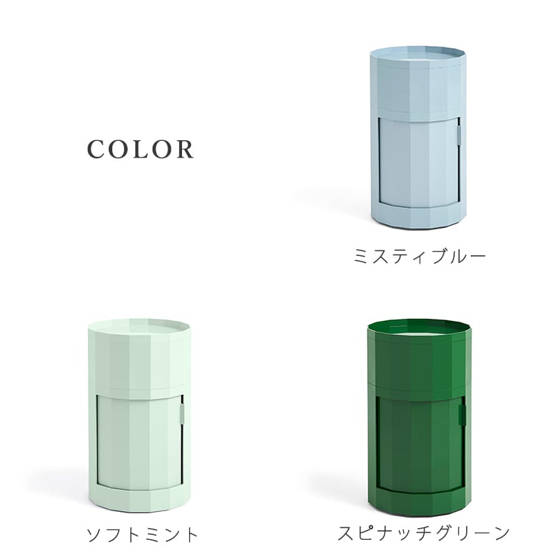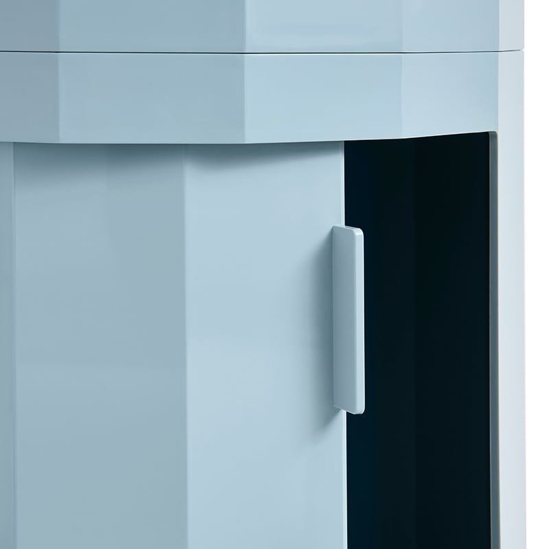 名前の由来である多面体(ファセット)の表面が、ミニマルなデザインに洗練されたアクセントとなり、また、FACETは視覚的な魅力と高い機能性を兼ね備えています。回転式ドアと取り外し可能なキャスターを備え、置く場所に合わせた使い方が可能です。