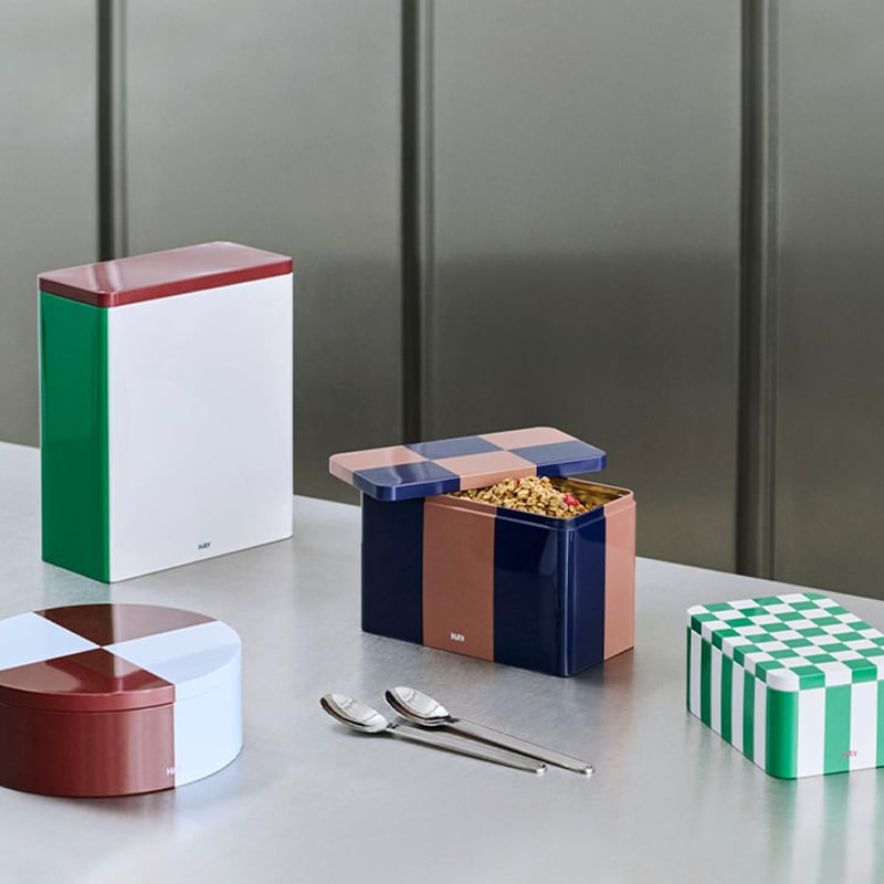 カラフルなチェック柄と光沢のある仕上げが特徴のTIN CONTAINERは、機能性と装飾性を併せ持つ収納缶です。フタと本体がぴったりと合わさるため、継ぎ目なく滑らかな見た目であるだけでなく、密閉性が高く乾燥食品の保存にも適しています。さまざまなサイズ、形、デザインを取り揃えており、お部屋の棚やテーブルの上などに飾って、さまざまなアイテムを整理整頓していただけます。