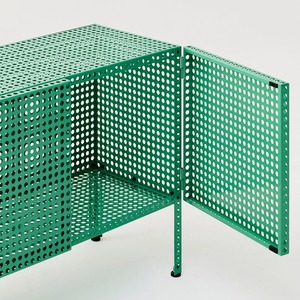 生活感をすべて隠してしまう収納でもなく、見せるオープンシェルフでもない、その中間を美しく表現した収納家具。無数の小さな穴が施されたスチール扉が、中に入れたもののシルエットをやわらかく透かし、“見えすぎない”安心感と、“感じられる”心地よさを叶えるデザインです。