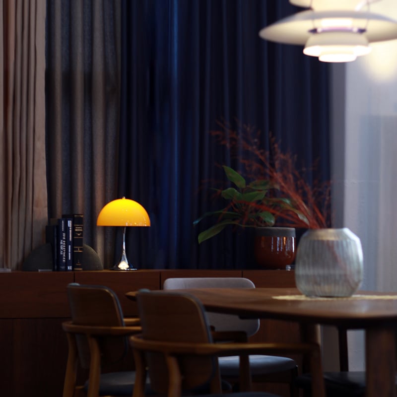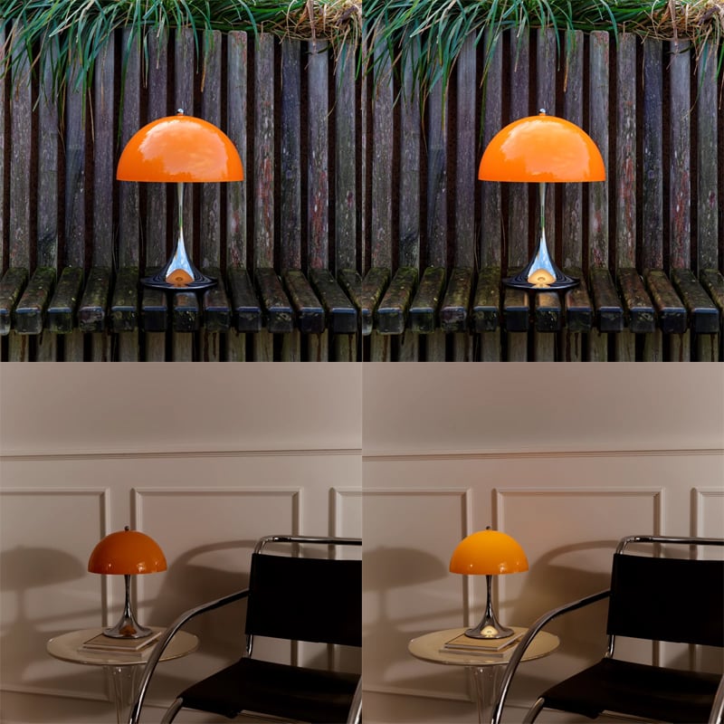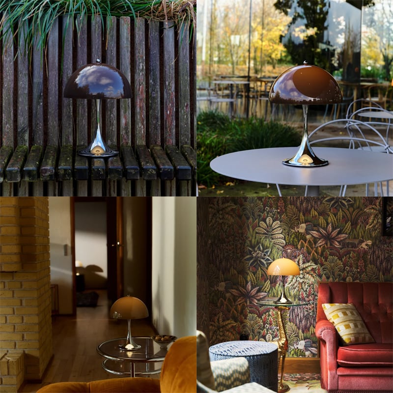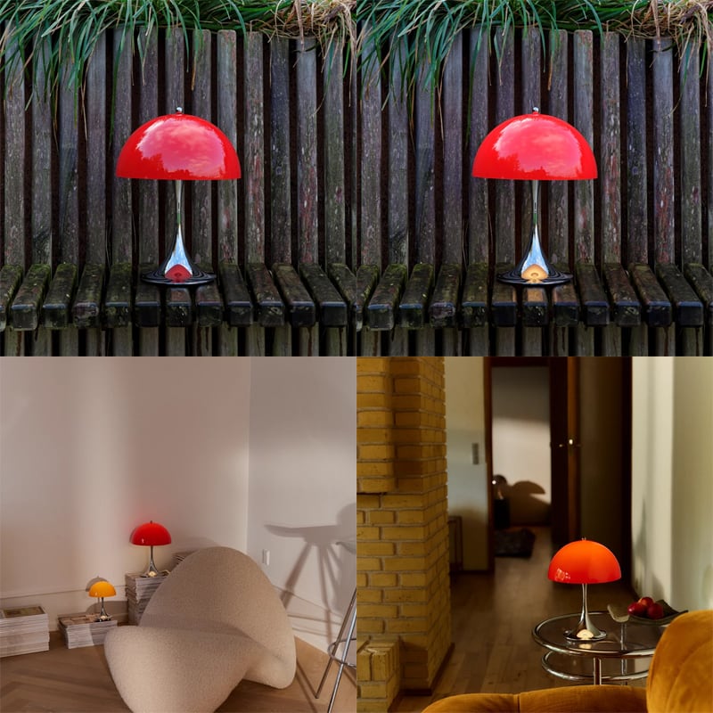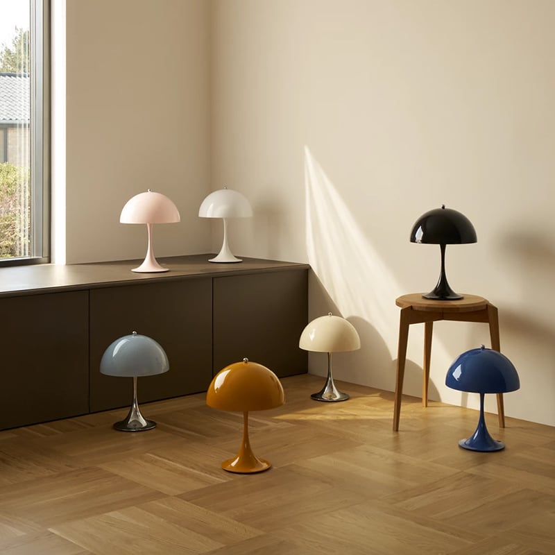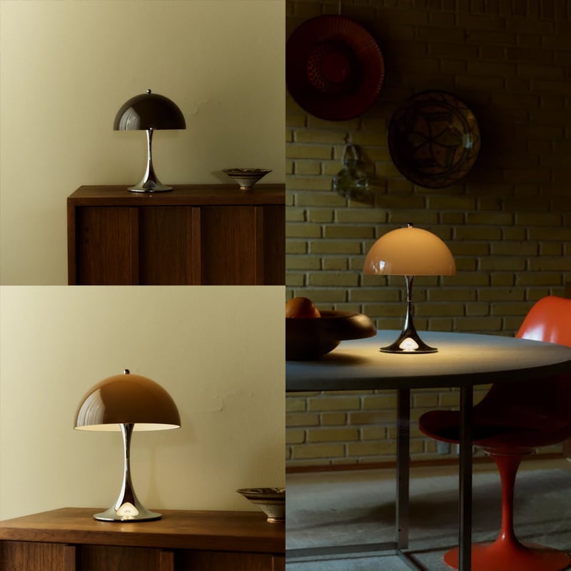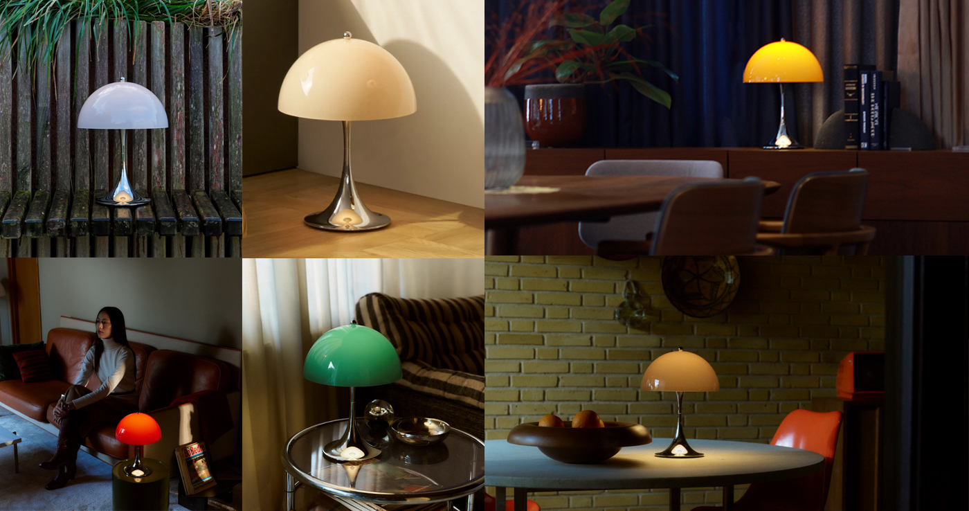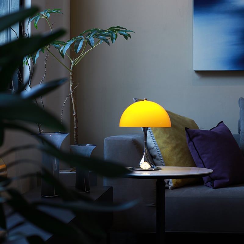 1971年にルイスポールセンとの共同開発により<パンテラ>を発表しました。<パンテラ>は、パントンの最も重要なデザイン・アイコンの一つとして知られ、有機的なフォルムと鮮やかなカラーヴァリエーションが典型的なパントン・デザインです。シェード内側から下側への反射やトランペット型ステムからの反射が織りなす効果により、アクリル製のシェードから心地よい光を拡散します。パンテラ 250 ポータブルは、直径250mmのシェードをもつ充電式のポータブルランプです。テーブル、棚、出窓などの狭いスペースにも置くことができます。光源の眩しさは見えず、下向きの光が支柱とベース部分で反射され、アクセントライトとなります。