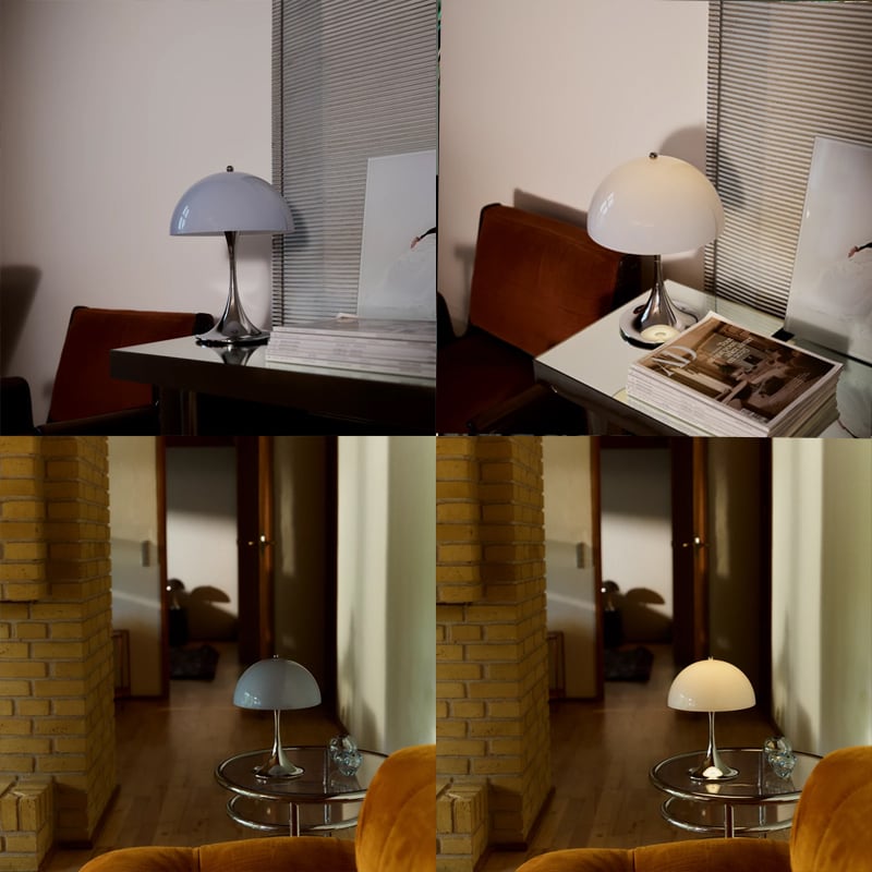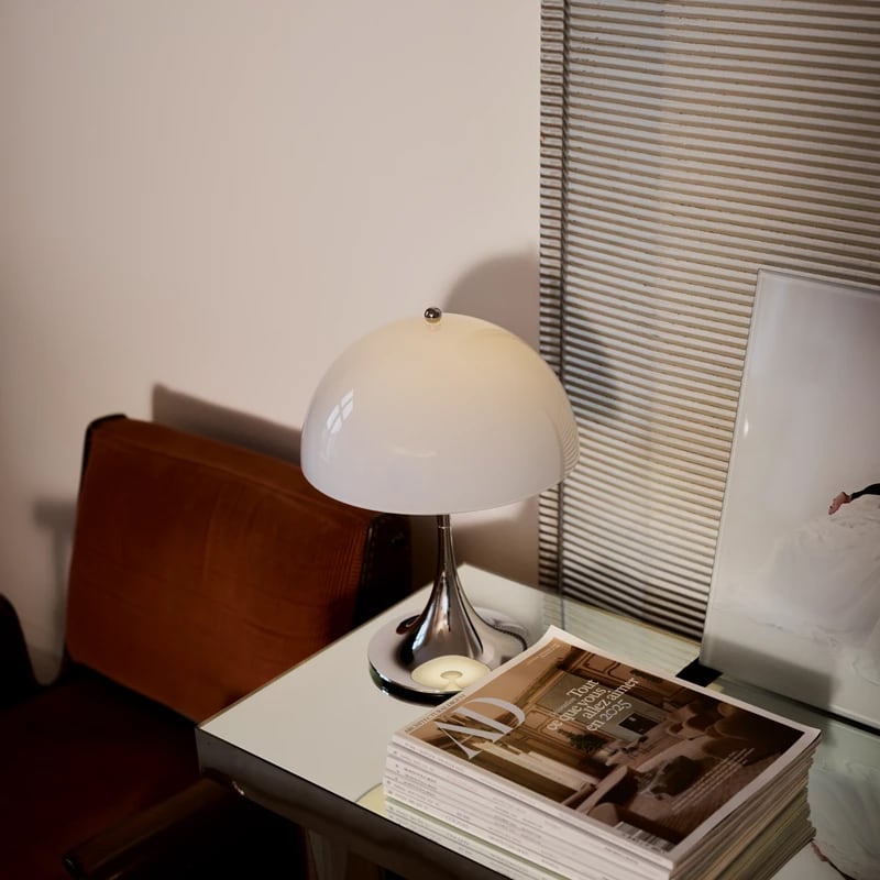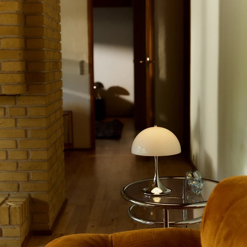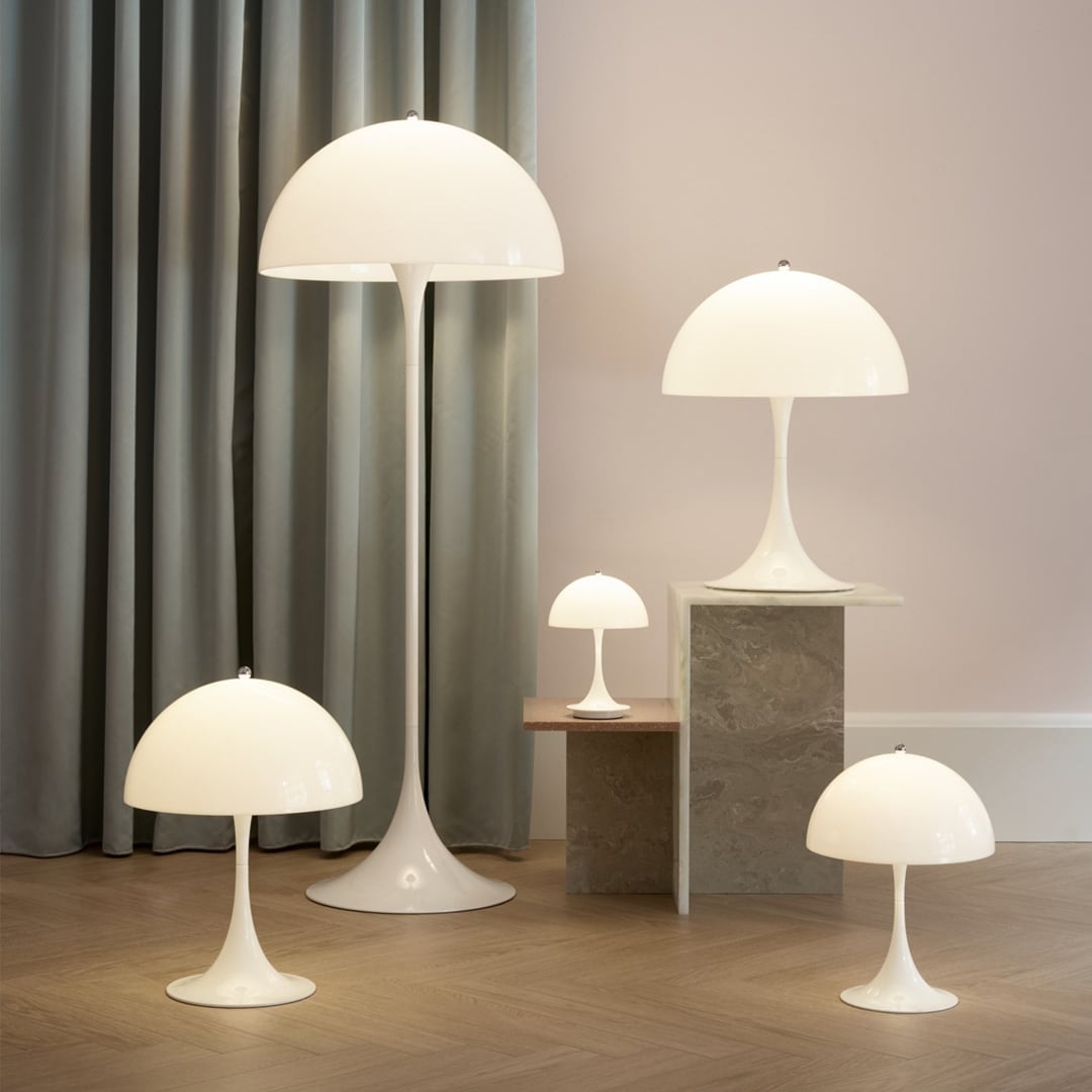 「パンテラ テーブル 400」のミニサイズで、160ポータブルより大きい中間サイズの充電式のポータブルランプ。シェード内側から下側への反射やトランペット型ステムからの反射が織りなす効果により、オパール・アクリルのシェードから心地よい光を拡散します。