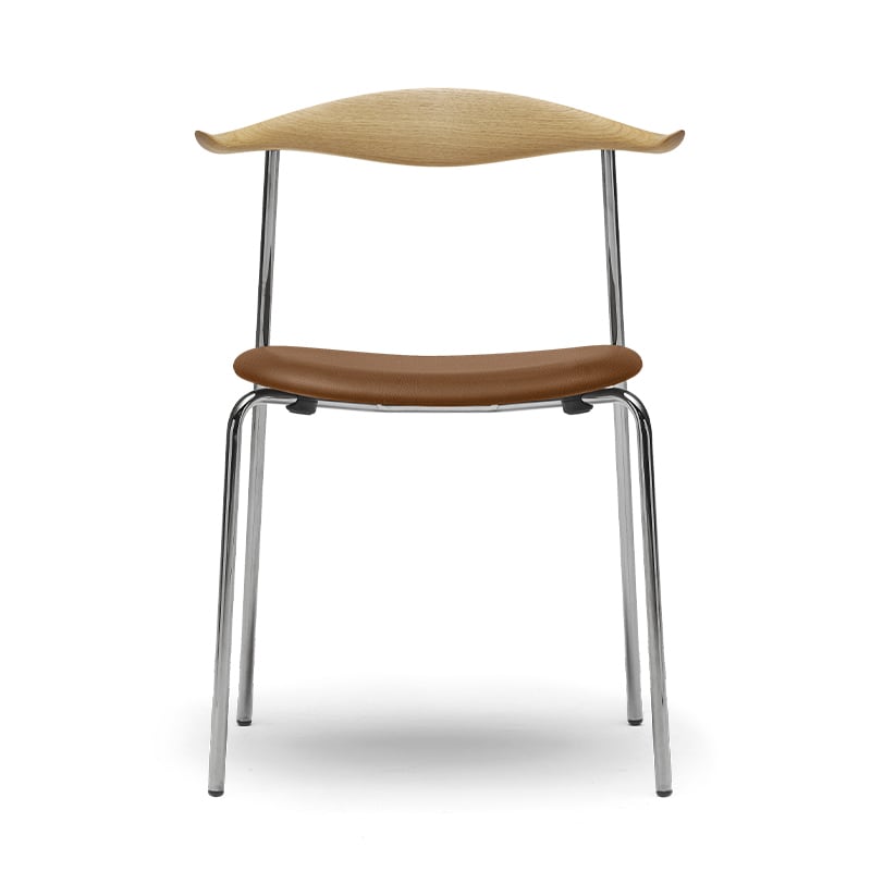ダイニングチェアCH88Pは、新しい素材と色彩に挑戦したウェグナーの意欲作。座面の張地、木材、そしてインダストリアルなスチールをウェグナーらしいミニマルなフォルムにまとめています。