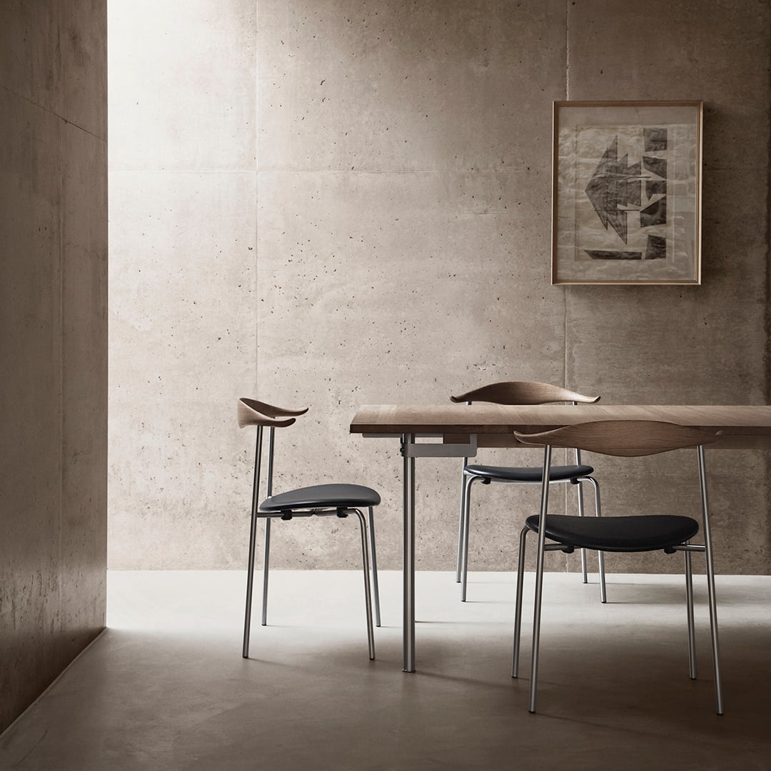 ダイニングチェアCH88Pは、新しい素材と色彩に挑戦したウェグナーの意欲作。座面の張地、木材、そしてインダストリアルなスチールをウェグナーらしいミニマルなフォルムにまとめています。