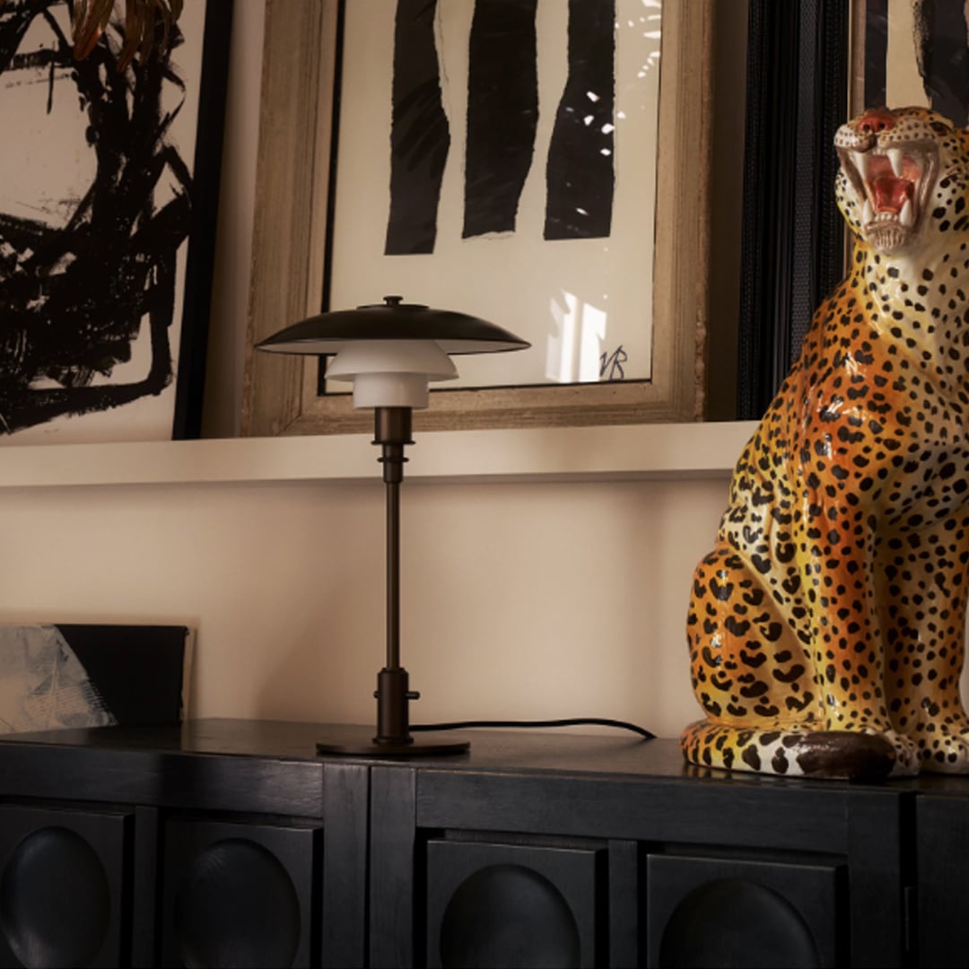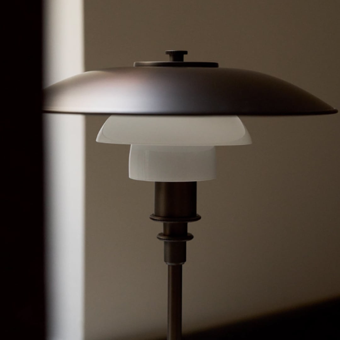 PH 3/2 Aged Brass Opalテーブルランプは、Poul Henningsen(ポール・へニングセン)の反射性3層シェードシステムをベースにしています。エイジド加工を施した真鍮のトップシェードとホワイトに塗装された内側が特徴で、眩しさを感じさせない心地良い下向きの照明を提供します。中央と下部のシェードは、3層のオパールホワイトの吹きガラスで作られています。外側は光沢仕上げ、内側はサンドブラスト加工のマット仕上げで、より柔らかい光を均一に分散し、より心地良い雰囲気を演出します。