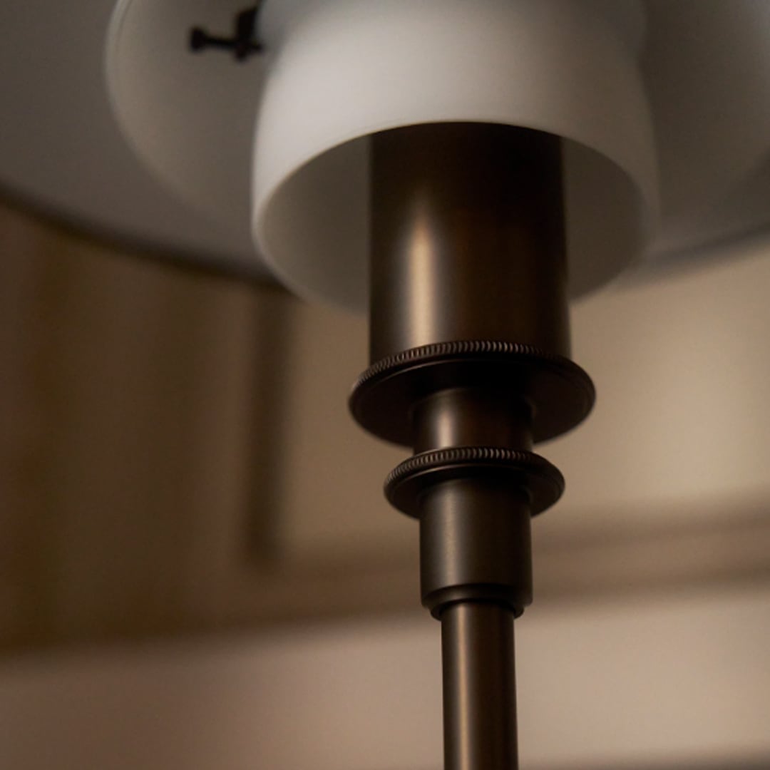 エレガントなオパールホワイトの吹きガラスシェードを組み合わせたこのランプは、テーブルや本棚、デスクにクラシックなタッチを添えます。