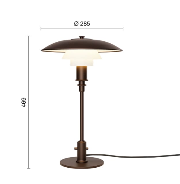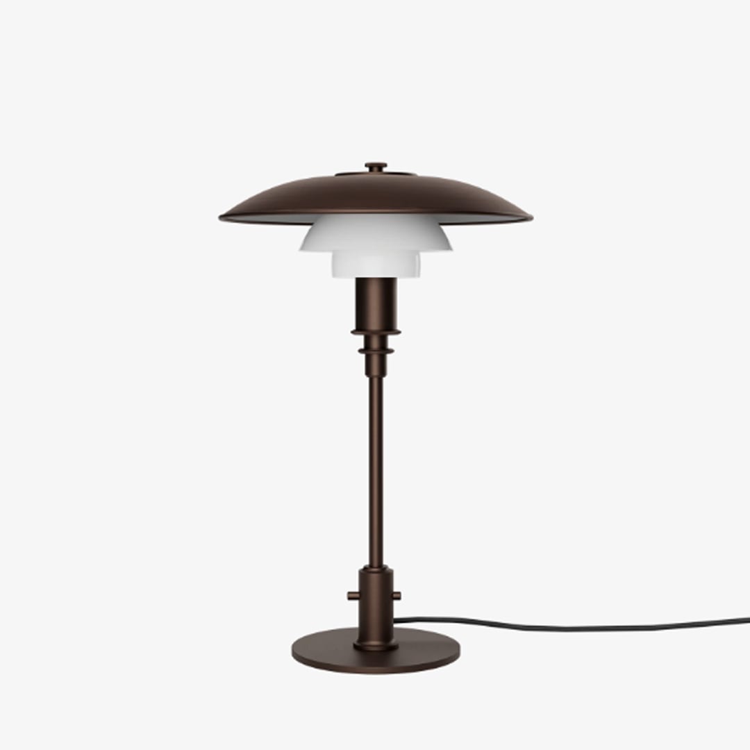 美しいラッカー塗装ダークブラウンエージド加工真鍮仕上げのPH 3/2 Aged Brass Opalテーブルランプは、1920年代のオリジナルのPHランプを想起させます。