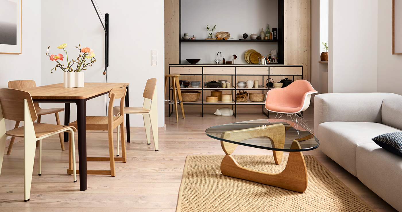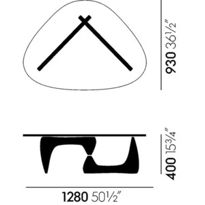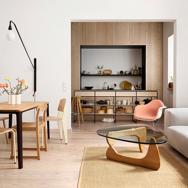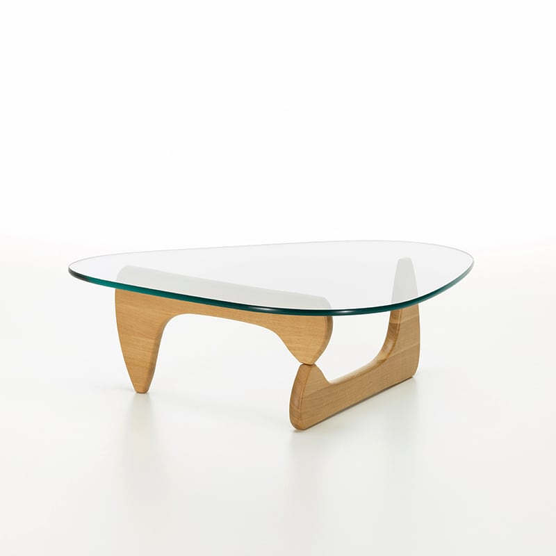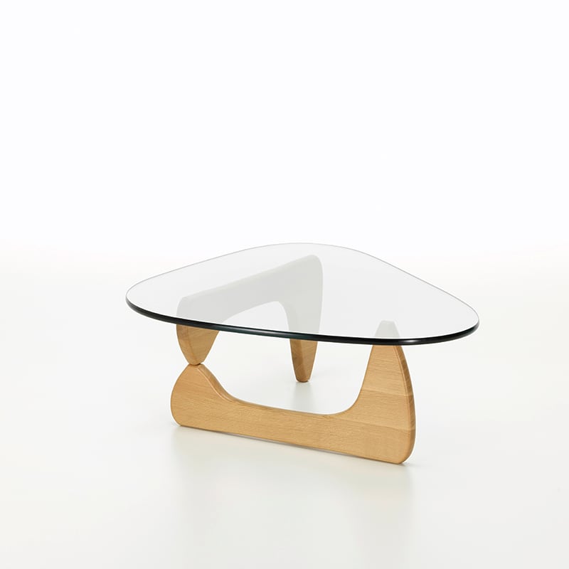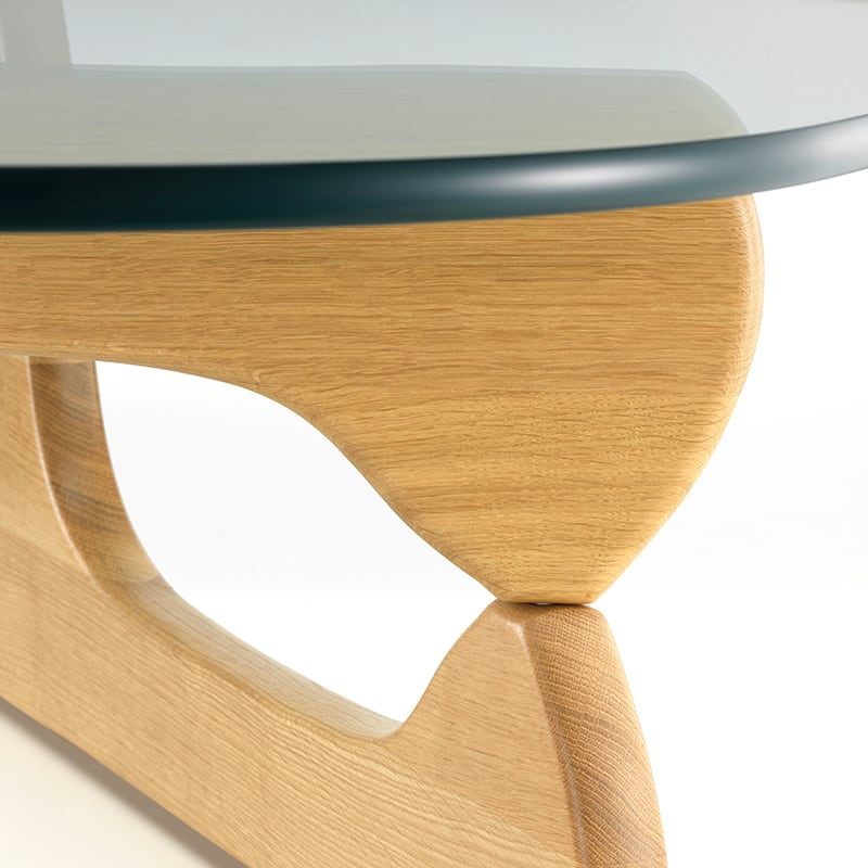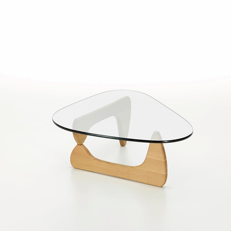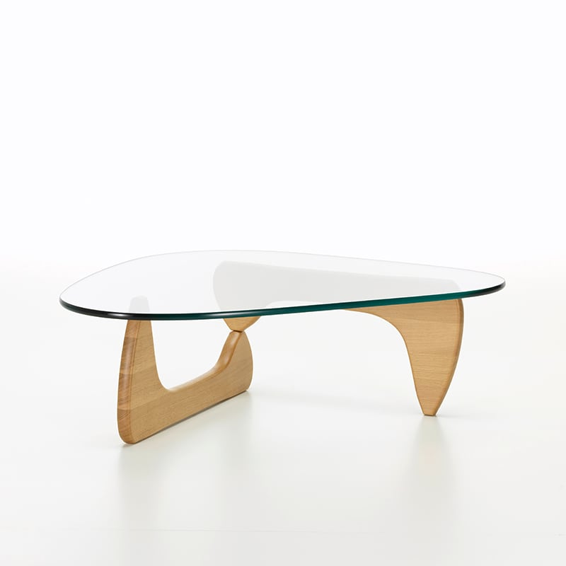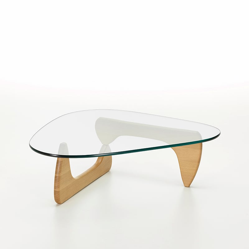 イサム・ノグチによる「コーヒー テーブル」は、ガラスの天板や脚部が有機的なフォルムで、まるで彼の彫刻作品の1つであるかのようなデザインです。ノグチ自身もこのテーブルを彼のこれまでの家具作品の中でも最高のデザインであると考えていました。脚は、重く頑丈なガラス天板を安定して支えるため、天板と直角に配置されており、素材はブラックアッシュ、メープル、アメリカンウォルナットの3種類から選択できます。