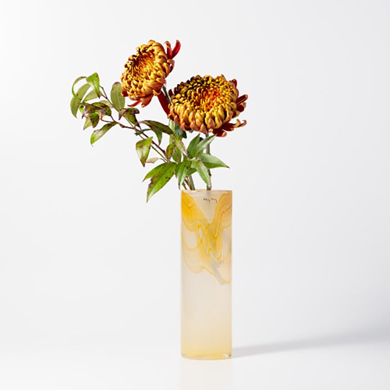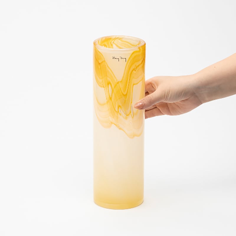 ガラスと植物、それぞれの個性が引き立つシンプルな円柱形のフラワーベース。形や色合い、さらに瑞々しい存在感の気泡がランダムに生じるため、ハンドメイドガラスならではの個性が楽しめます。さまざまな花との相性が良く、大ぶりな花や枝ものもたっぷりと活けることができるサイズです。