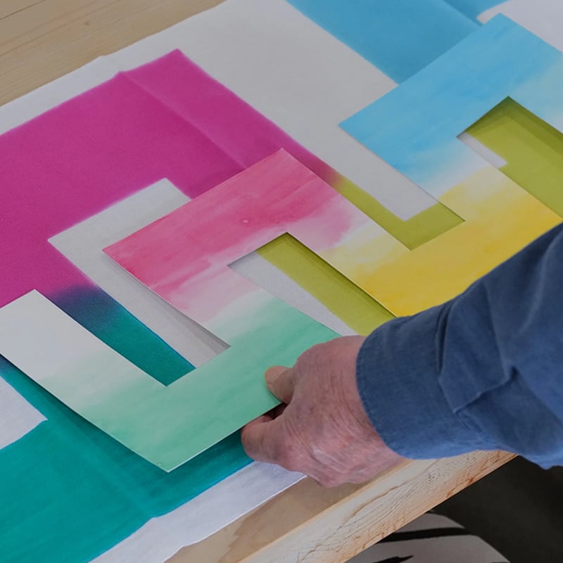 春の新作3種の中で、最初に思いついたというこのデザイン。原画は、石本が選んだ鮮やかな4色の水彩絵の具を画用紙に塗り、それをカットしてつくられました。それをてぬぐいの枠いっぱいに拡大することも可能でしたが、製作上の都合もあり、左右上下の余白を残すことに。