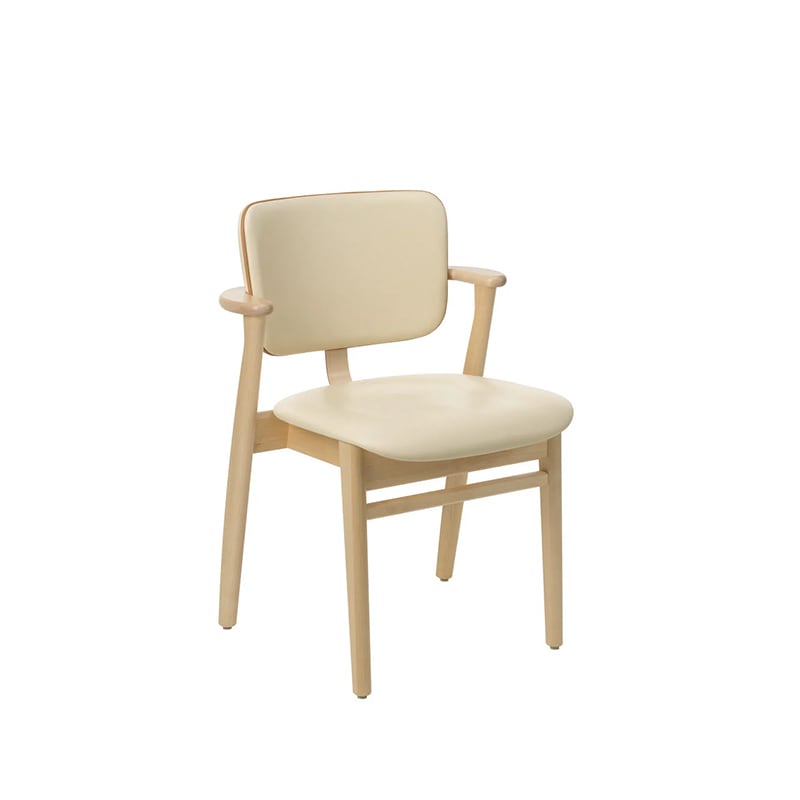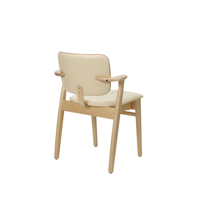 「ドムス チェア」は、1946年、イルマリ・タピオヴァーラにより、ヘルシンキの学生寮「ドムス アカデミカ」のためにデザインされました。三次元に曲線を描く座面は、長期間座っても疲れにくく、特徴的な小さめの肘掛けは、肘置きとしての役割を果たしながらも、腰かける人の動きを妨げず、テーブルに椅子を引き寄せやすいよう考慮されています。