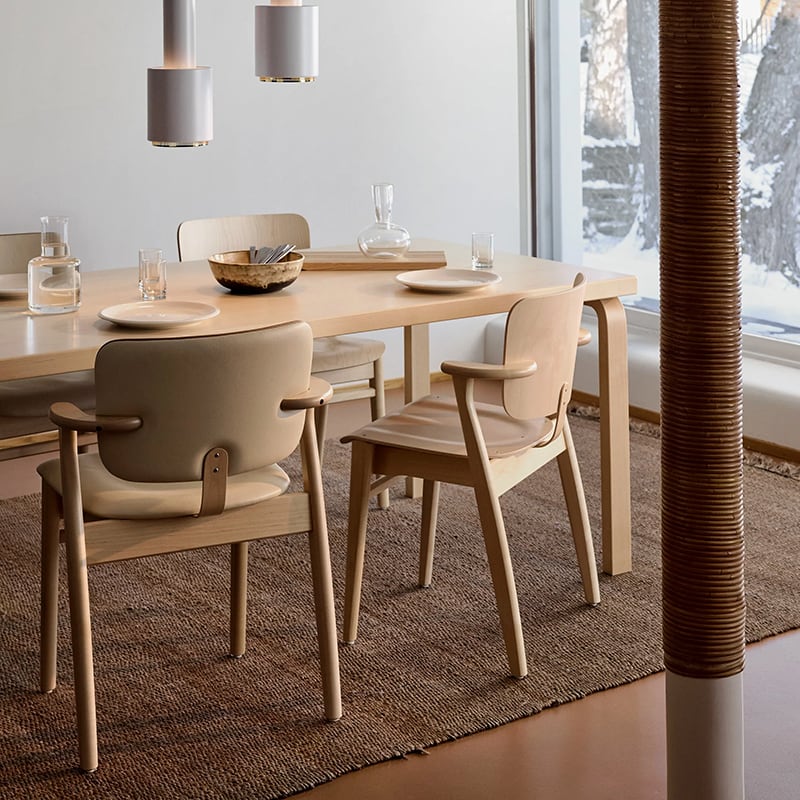 定番であった木製仕様に、10種類の多彩な組み合わせの張地仕様「Beauty versions」が加わりました。新たなバリエーションは、レザーまたは生地張りの背座に、レザーのパイピングが施されています。幅広いインテリアに調和するよう厳選されたカラーは、インテリアデザイナーとして活躍したイルマリ・タピオヴァーラが作成したカラーチャートに着想を得ています。