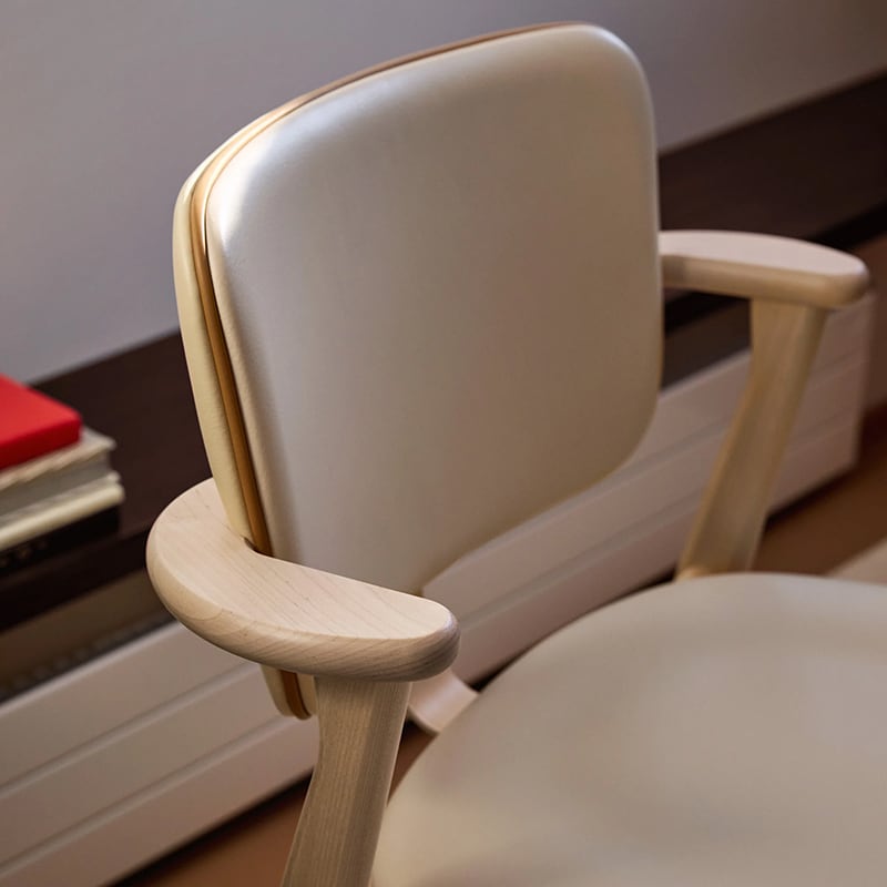柔らかくカーブを描く座面と背もたれは身体に馴染み、長時間の勉強にも休憩中にも、心地よさを保ってくれます。定番であった木材のみの仕様だけでなく、張地仕様が加わることで、より快適性と上質さが高まります。新たな張地とカラー、仕様のバリエーションによって、北欧のミニマルな空間から、豪華で重厚感あるインテリアまで、あらゆる環境に自然と馴染む普遍性、適応性、多用途性がより一層際立ちます。