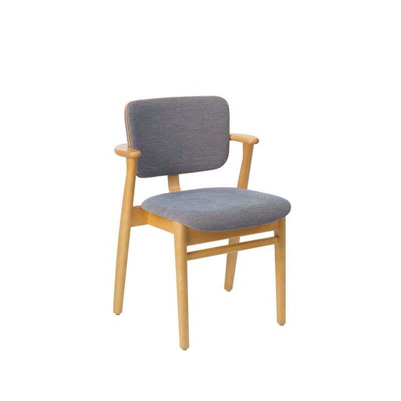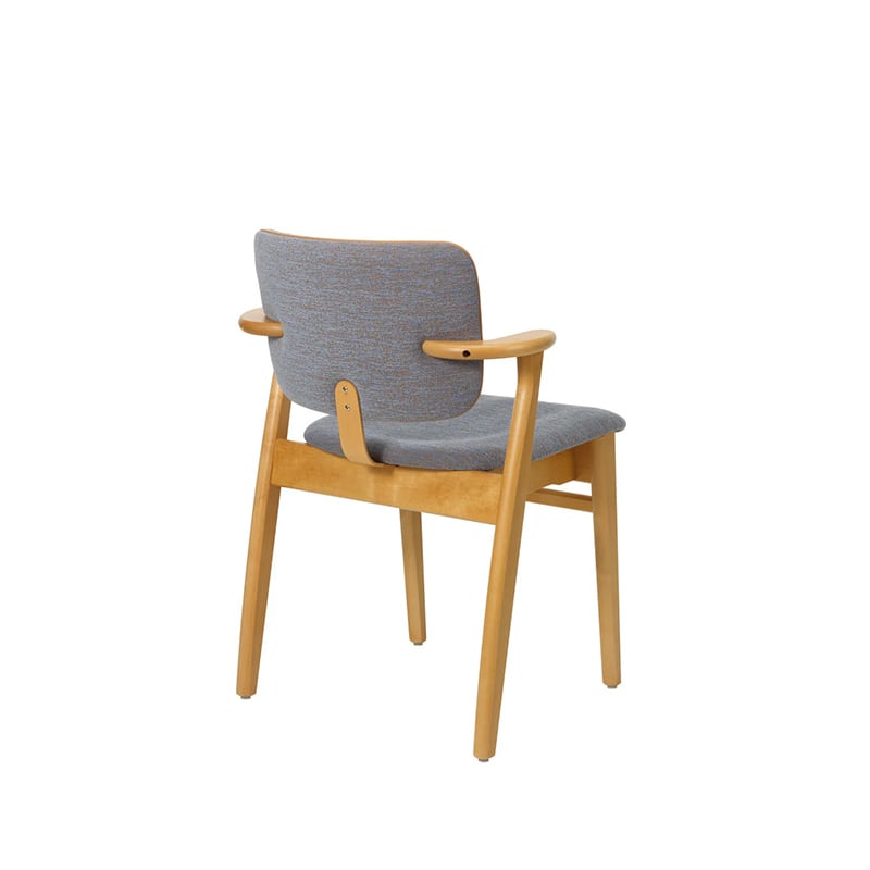 「ドムス チェア」は、1946年、イルマリ・タピオヴァーラにより、ヘルシンキの学生寮「ドムス アカデミカ」のためにデザインされました。三次元に曲線を描く座面は、長期間座っても疲れにくく、特徴的な小さめの肘掛けは、肘置きとしての役割を果たしながらも、腰かける人の動きを妨げず、テーブルに椅子を引き寄せやすいよう考慮されています。