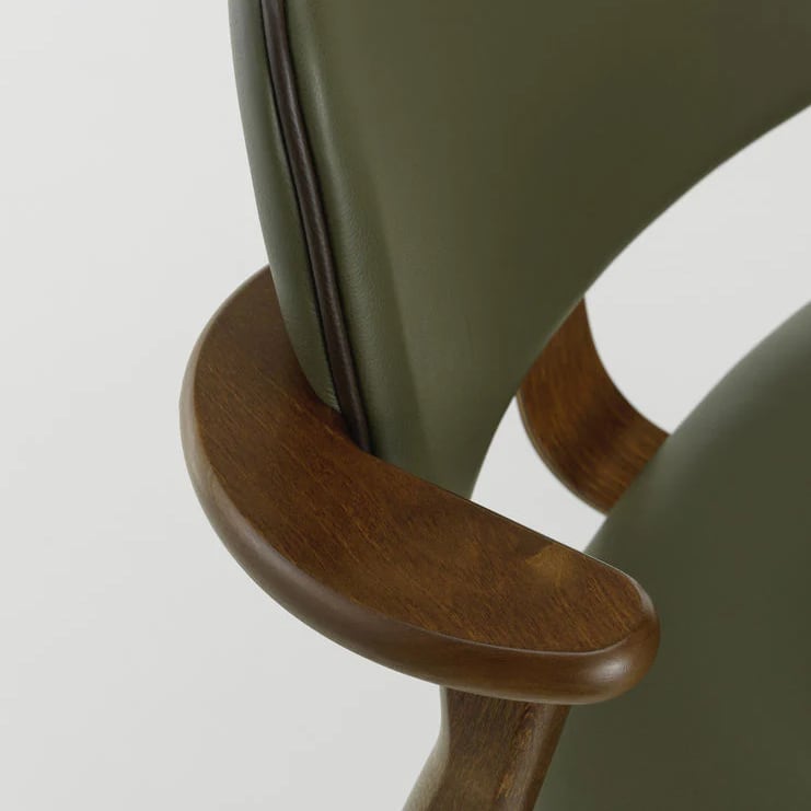 「ドムス チェア」の快適性と機能性を両立させる、ふたつの重要なデザイン要素があります。ひとつは、人の身体に沿って三次元に婉曲させた成形合板の座面、もうひとつは、あえて短く設計された印象的なひじ掛けです。