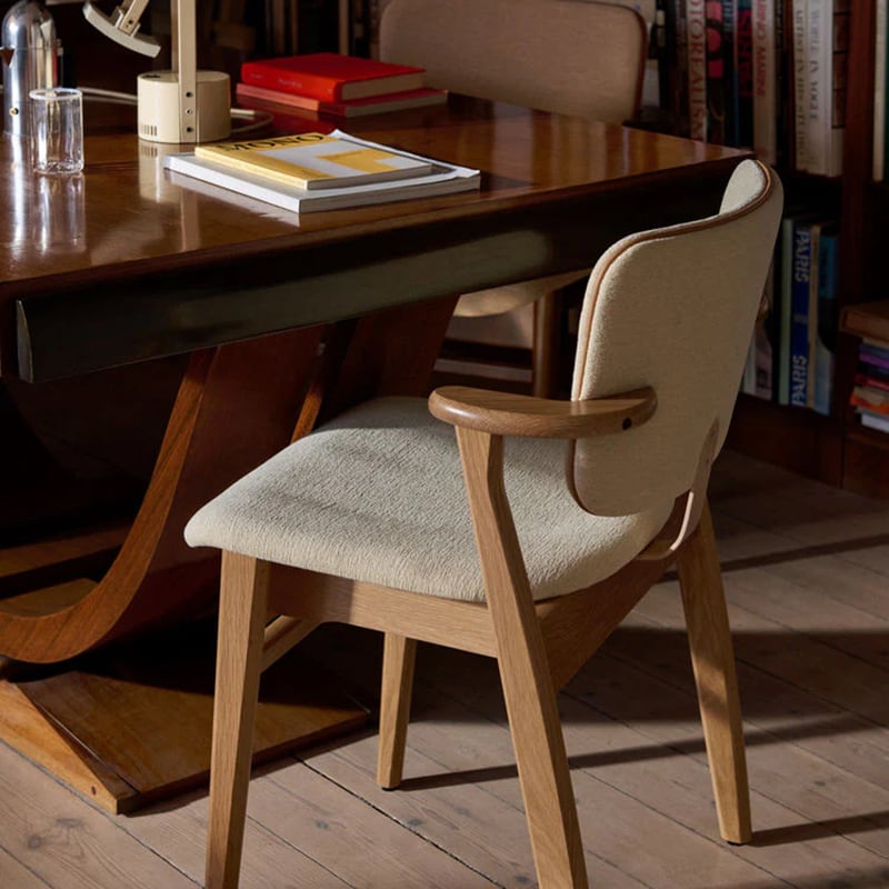 柔らかくカーブを描く座面と背もたれは身体に馴染み、長時間の勉強にも休憩中にも、心地よさを保ってくれます。定番であった木材のみの仕様だけでなく、張地仕様が加わることで、より快適性と上質さが高まります。新たな張地とカラー、仕様のバリエーションによって、北欧のミニマルな空間から、豪華で重厚感あるインテリアまで、あらゆる環境に自然と馴染む普遍性、適応性、多用途性がより一層際立ちます。