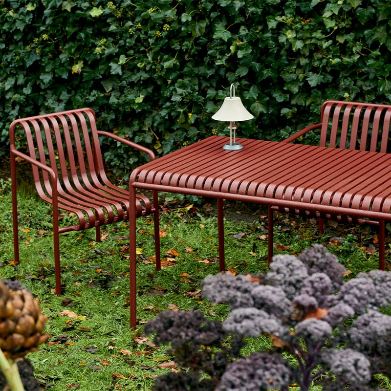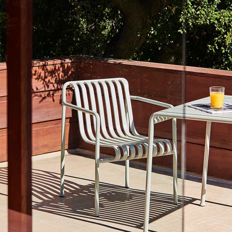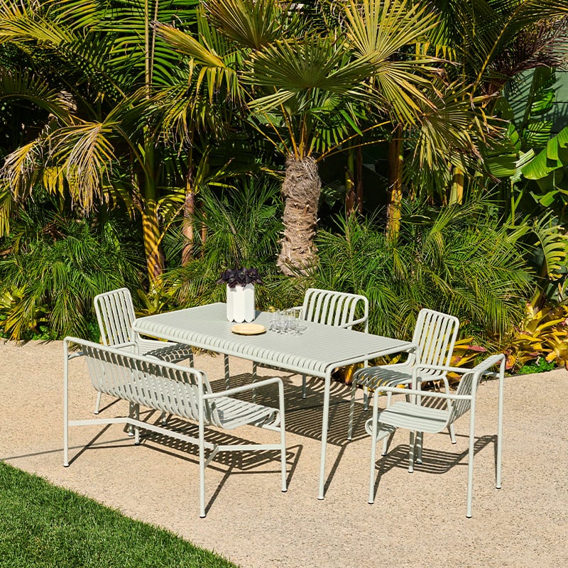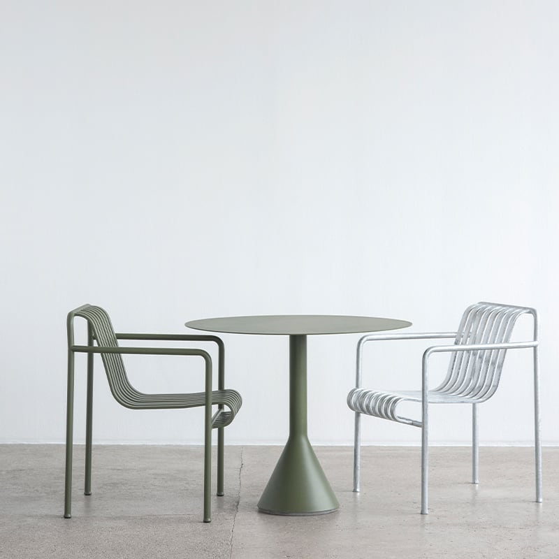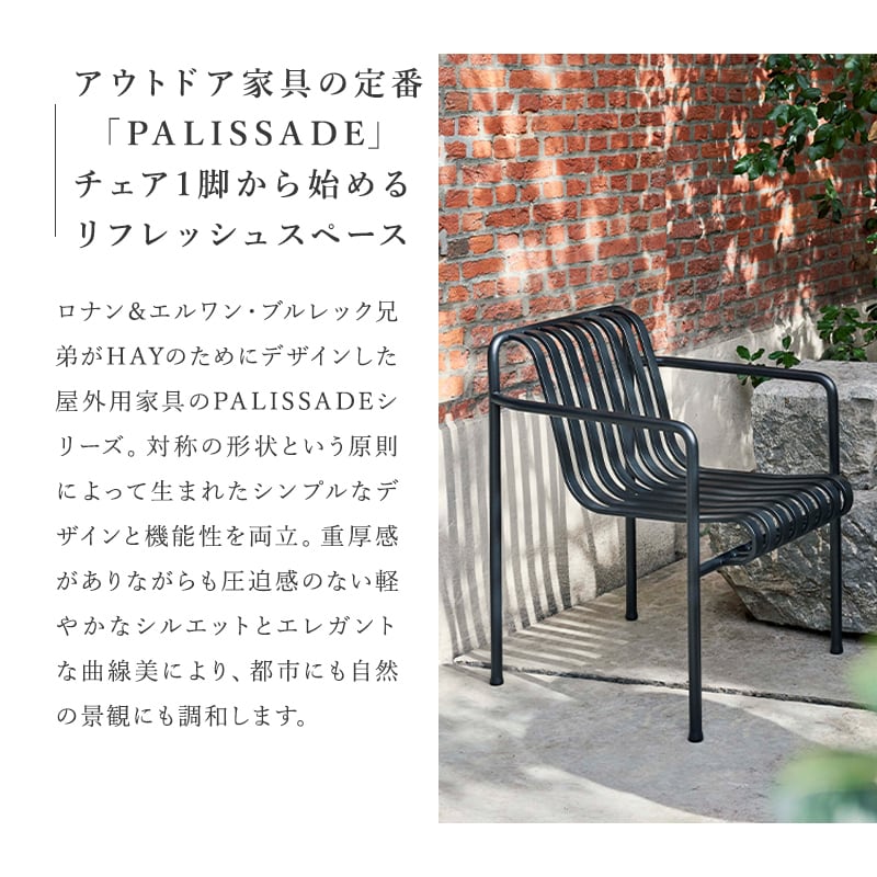 ロナン&エルワン・ブルレック兄弟がHAYのためにデザインした屋外用家具のPALISSADEシリーズ。対称の形状という原則によって生まれたシンプルなデザインと機能性を両立。重厚感がありながらも圧迫感のない軽やかなシルエットとエレガントな曲線美により、都市にも自然の景観にも調和します。また、天候の影響を直に受ける屋外使用を考慮した、十分な強度と耐久性、耐候性を備えています。