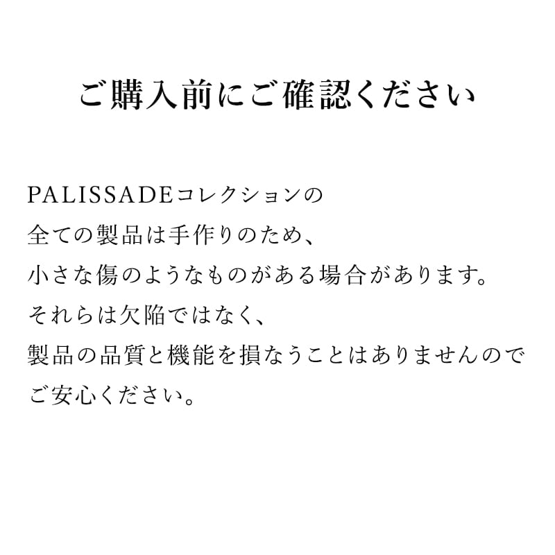 PALISSADEコレクションの全ての製品は手作りのため、小さな傷のようなものがある場合があります。それらは欠陥ではなく、製品の品質と機能を損なうことはありませんのでご安心ください。