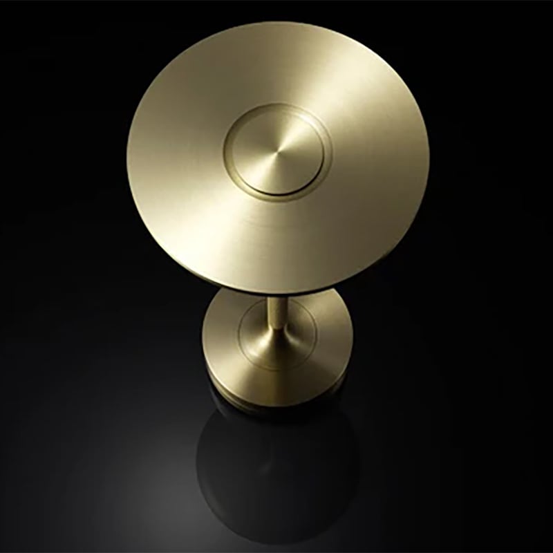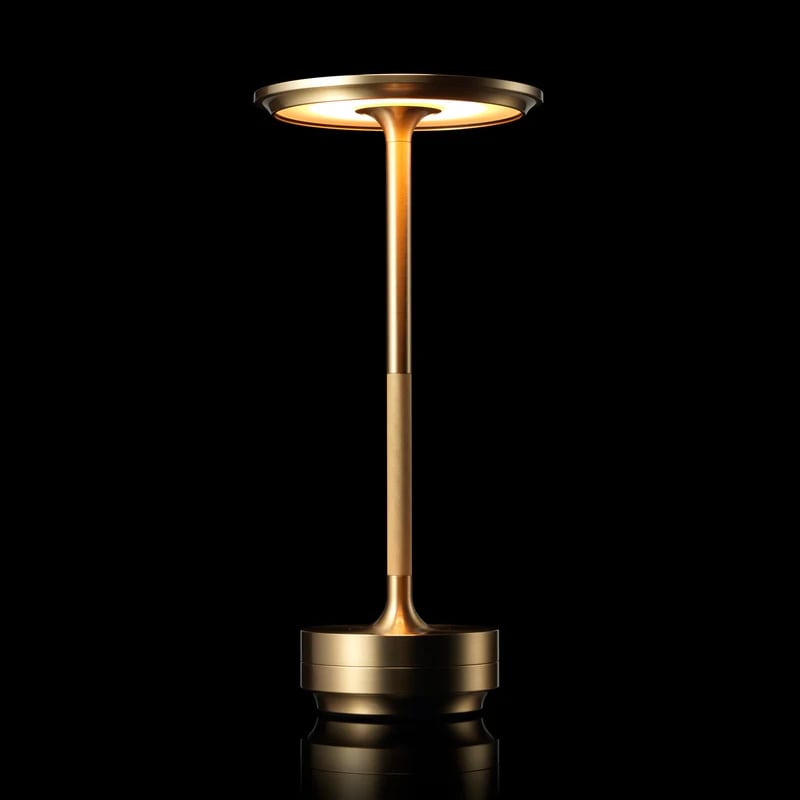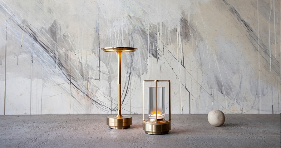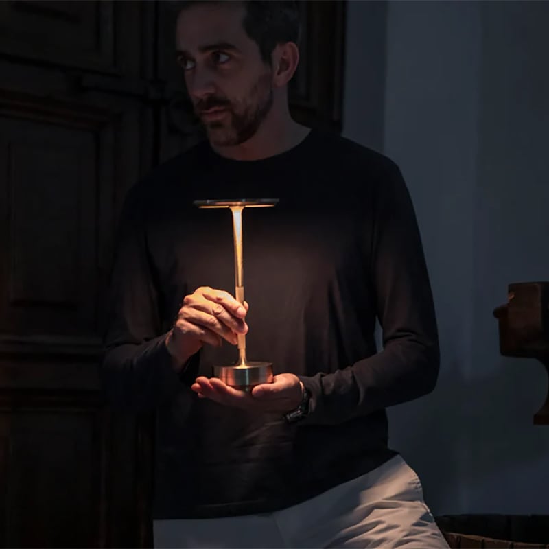 金属のかたまりから削り出した端正な姿、手に馴染む硬質なテクスチャー。真っすぐに立ち上がる姿から、やわらかな光を照らすコードレス・テーブルランプ。温かな暗みで満たされて、夜が特別な時間に。