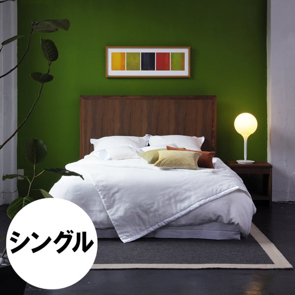 高さのあるヘッドボードの輪郭は無垢材を使用しており、木肌の質感は部屋の印象を和らげ、くつろぎを与えてくれます。。床板はひのき材のすのこ(2枚)を使用。抗菌・消臭効果があると言われます。通気性もよく、湿気も上手に逃がしてくれますので、カビ防止に役立ちます。またひのき特有の香りが、リラックス効果と心地よい眠りを誘います。ベッドフレームの横幅はマットレスのサイズに合わせてあるので、シングルを2台並べてキングサイズとして使う事もできます。