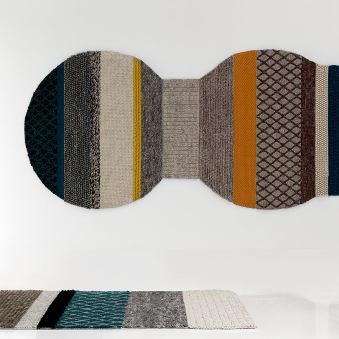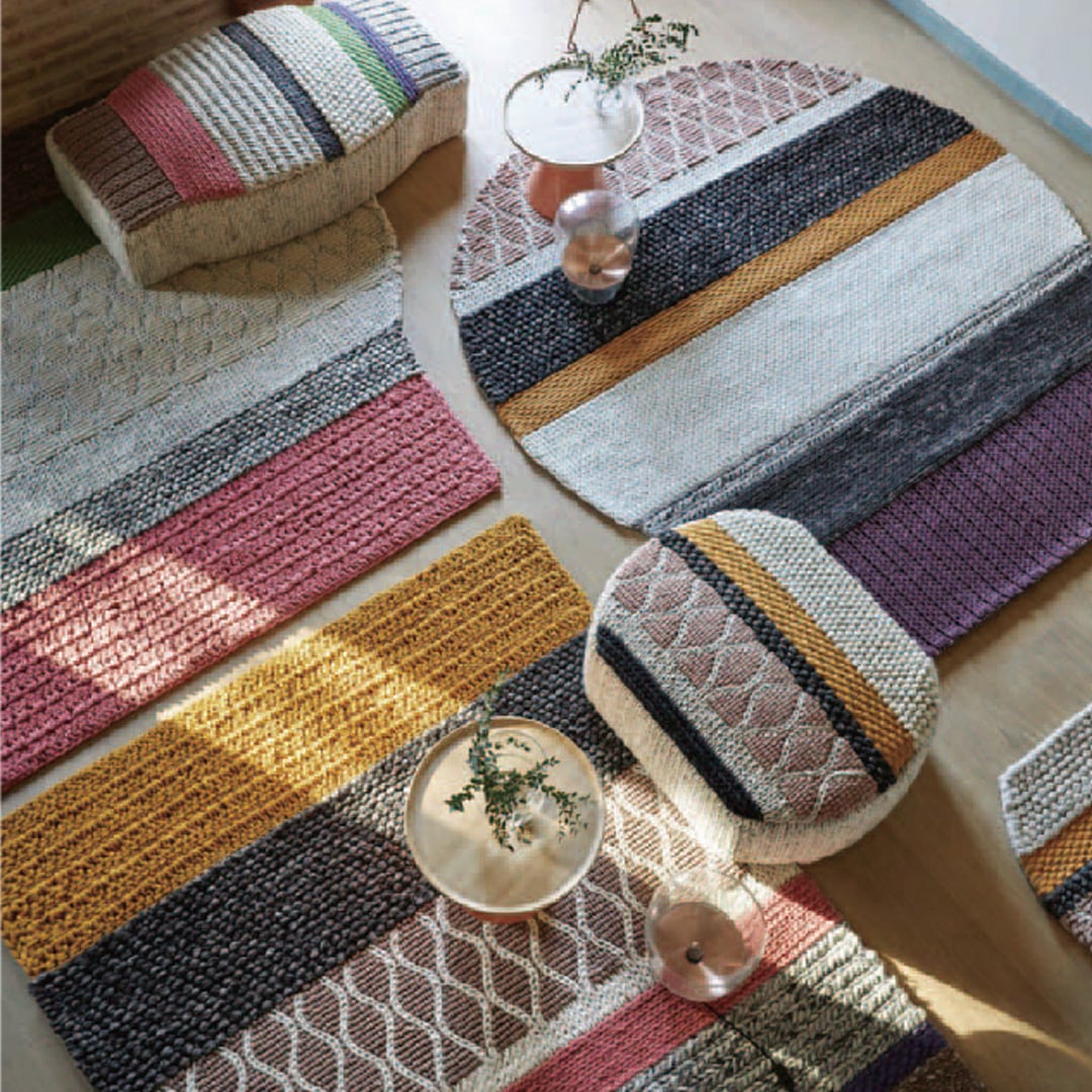 ラグの世界に革新的なデザインを投げかけたMangas Original。さまざまな素材と織り方をパッチワークして創り上げたラグは、ざっくりと編んだ手編みのセーターを彷彿とさせる暖かさとボリューム感で、足元から包み込んでくるような印象を与えます。床から立ち上げてタペストリーのように壁に配するなど、色・形・サイズを組み合わせてコーディネートを楽しめ、これまでにない自由な発想で空間表現ができる優れたデザインです。