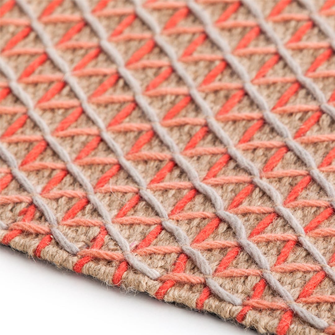 ジュートをベースに出来ているナチュラルな素材感。アクセントでウールの糸の幾何学なステッチがナチュラル過ぎないモダンな表情を作り上げています。ガラスやアイアンの固い素材、白や黒のモノトーンで固めすぎてしまった空間にこのラグが入ると、お部屋の雰囲気を壊すことなく表情を和らげてくれます!