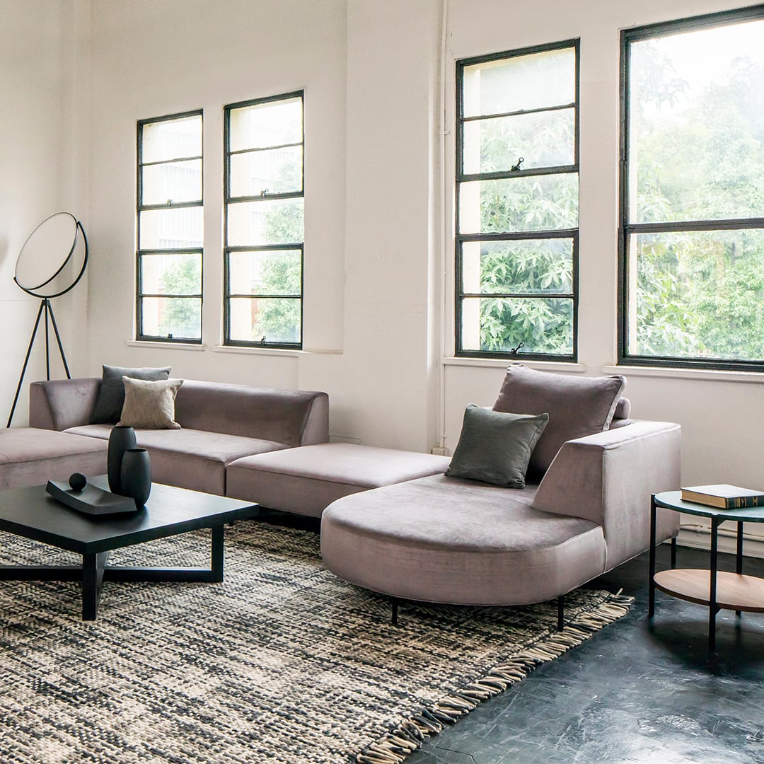 モノトーンの色合いがお部屋の雰囲気をぐっと引き締めてくれます。色としてはブラックの強めの色も混ざり合っていますが、素材がウールでできているため、強すぎず、暗めの色のソファも受け止めてくれます。厚みもあり、足元も柔らかく、直接でも座っていただきやすいラグです。